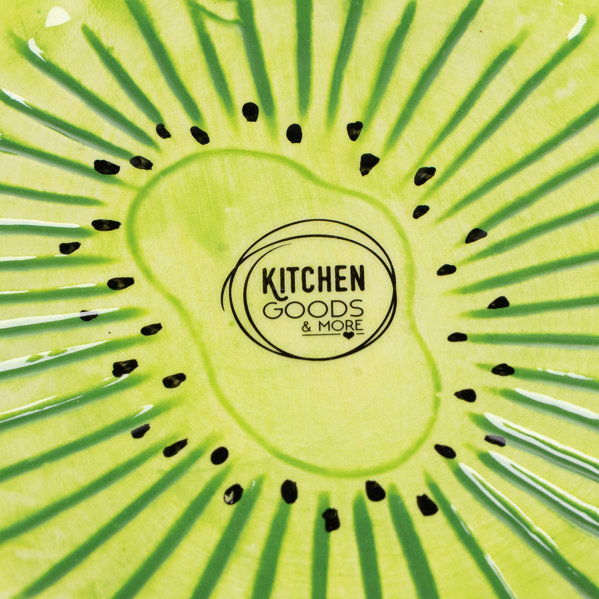 Ces assiettes en céramique de haute qualité allient fonctionnalité et élégance discrète. Ornées d'un motif de kiwi réaliste, elles évoquent non seulement des souvenirs de fruits exotiques, mais se révèlent également d'une grande polyvalence. Leur couleur verte chaude, rehaussée de touches claires, apporte une note estivale et joyeuse à toute table – idéale pour un pique-nique en plein air ou un brunch en famille à la maison.
