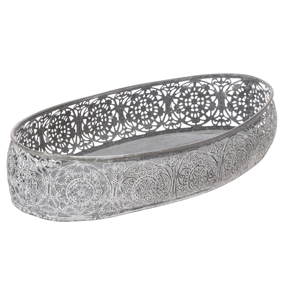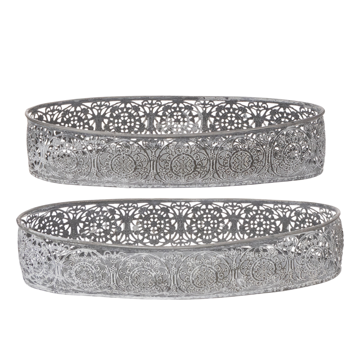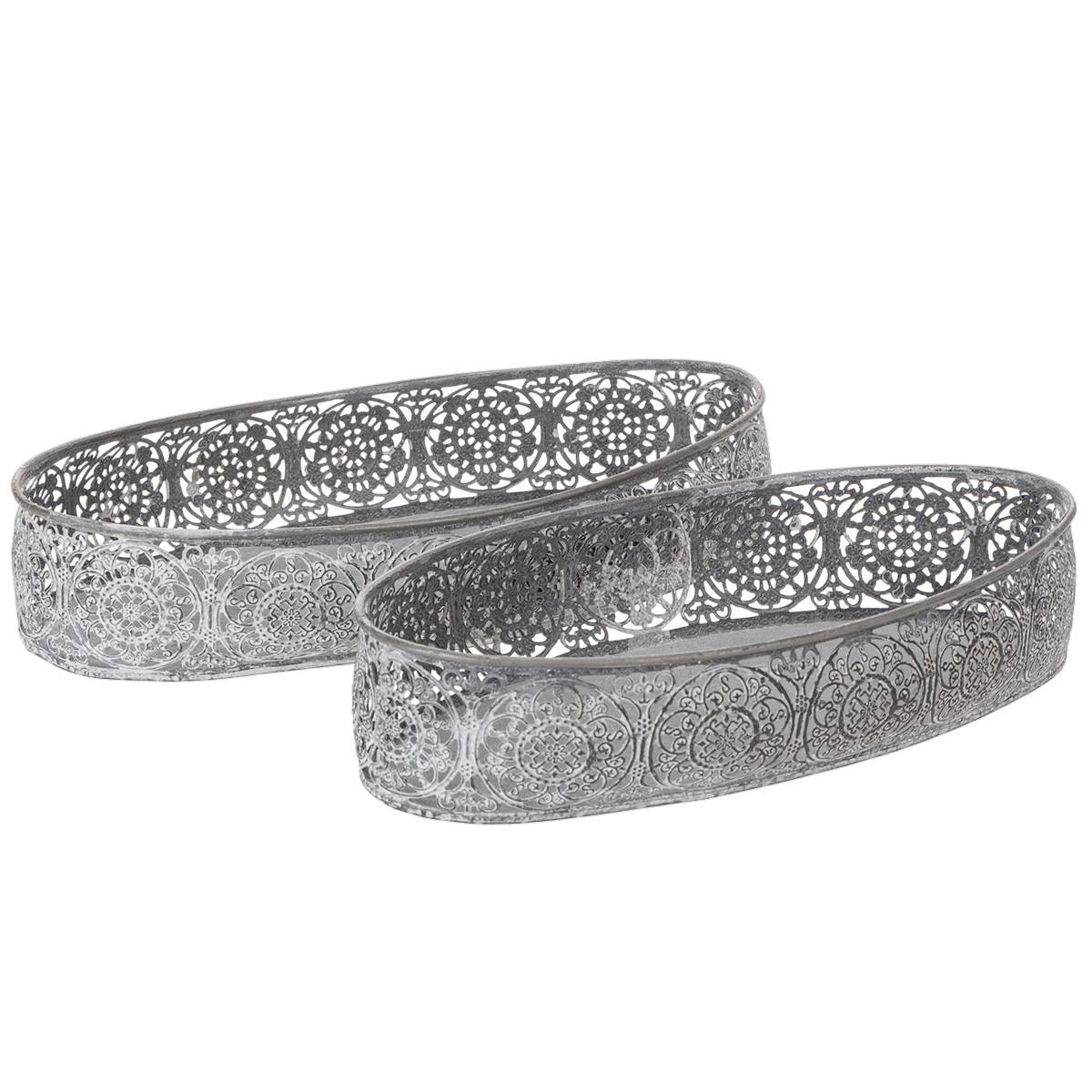 Deze twee prachtige decoratieve schalen van metaal en met een decoratieve rand zullen zeker een plekje vinden op je dressoir of dressoir. Passend bij het filigrane bloemenpatroon, zijn de metalen schalen zilvergrijs en witgewassen. Perfect voor een ladekast in de trendy vintage stijl!