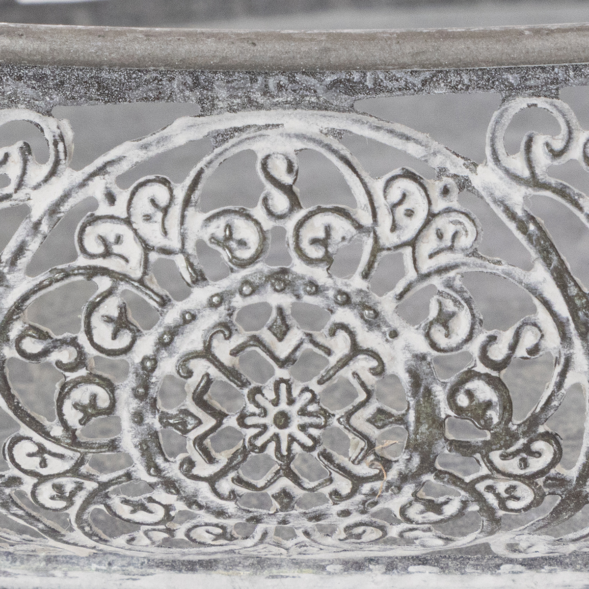 Diese zwei schönen Dekoschalen aus Metall und mit Zierrand finden ganz sicher einen Platz auf Ihrer Kommode oder Anrichte. Passend zum filigranen floralen Muster sind die Metallschalen in Silbergrau gehalten und weiß gewaschen. Perfekt also für eine Kommode im angesagten Vintage-Stil!