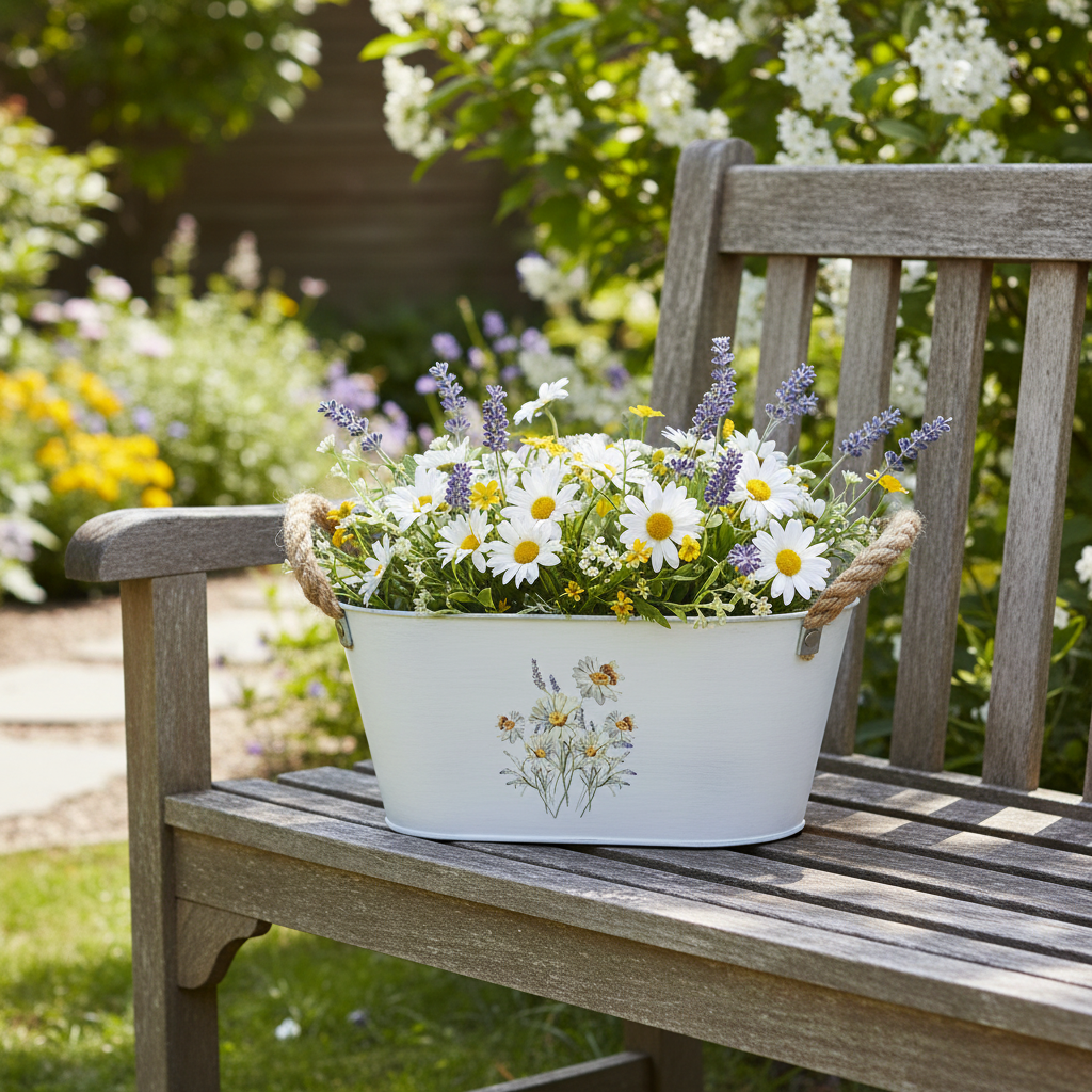Des marguerites blanches et de la lavande violette fleurissent sur le bol décoratif ovale en métal. Les abeilles visitent les fleurs. Deux poignées en jute complètent astucieusement l'image naturelle du bol en métal blanc.