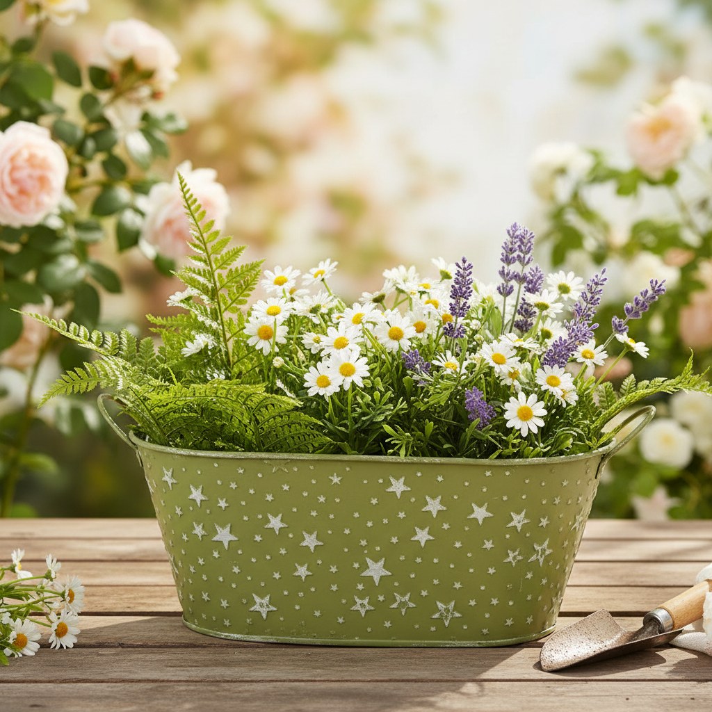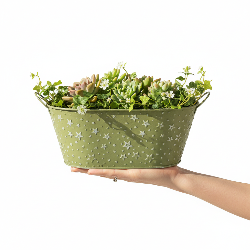Welkom in een wereld vol decoratiedromen! Of je hem nu gebruikt als bloempot voor Kerstmis, als plantenbak voor feestelijke planten of als elegante bloempot, deze mosgroene schaal met sterren in reliëf is de perfecte keuze voor decorateurs en bloemisten met oog voor detail. De deels versleten verf op de sterren en het doorschijnende metaal zorgen voor een unieke kerstdecoratiebloempot die in geen enkele feestelijk versierde kamer mag ontbreken.