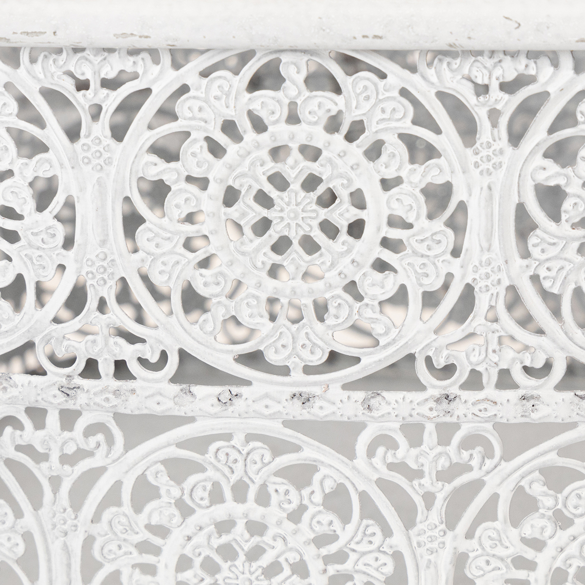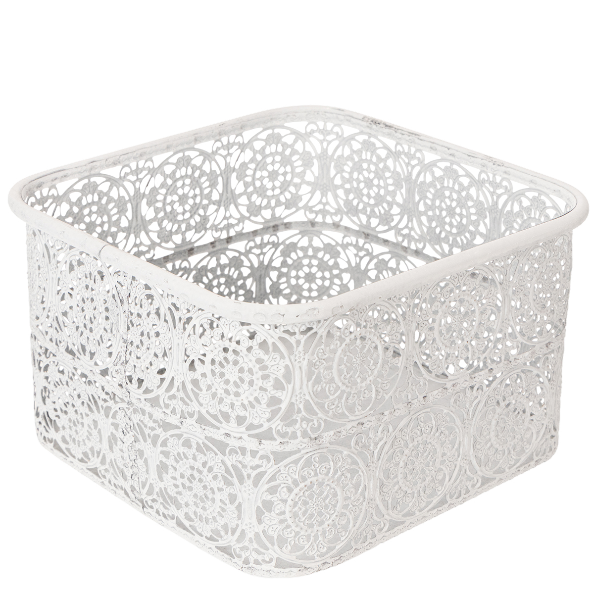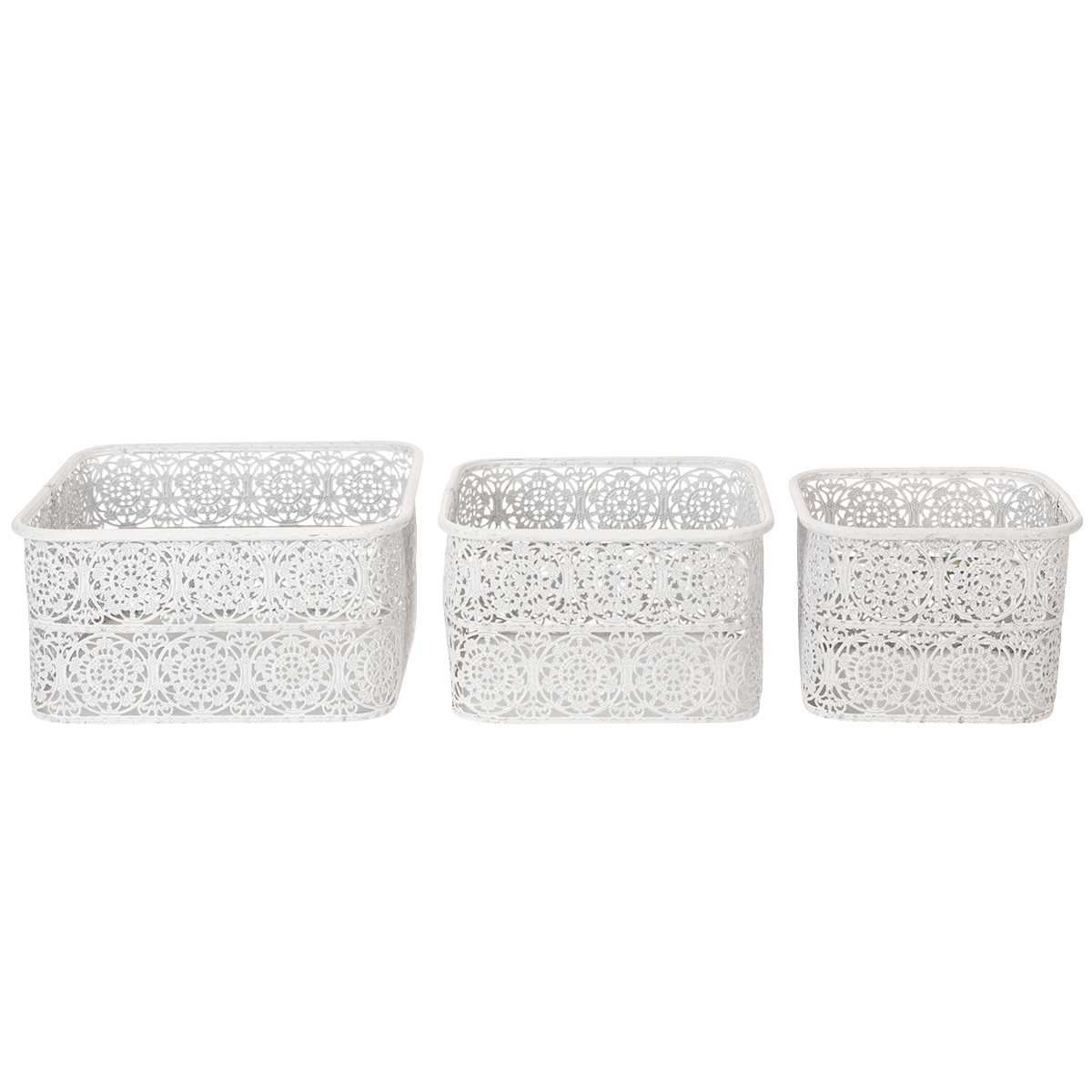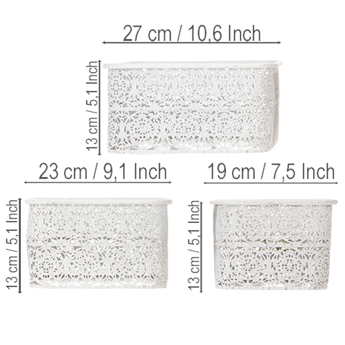 Diese Metallschalen mit Spitzenmuster kommen im praktischen 3er-Set in unterschiedlichen Größen. Die eckigen Dekogefäße sind im angesagten Shabby Chic gestaltet, sodass durch den weißen Anstrich das Silber des Metalls stellenweise durchscheint.