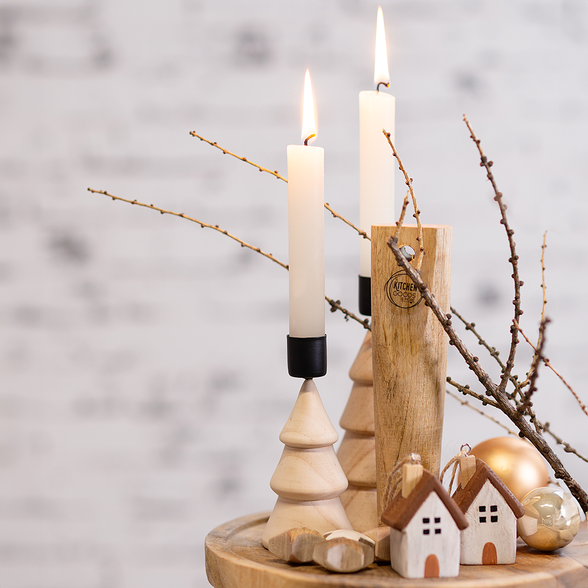 Stabkerzenhalter aus Holz als Tannenbaum für natürliche Weihnachtsdekoration