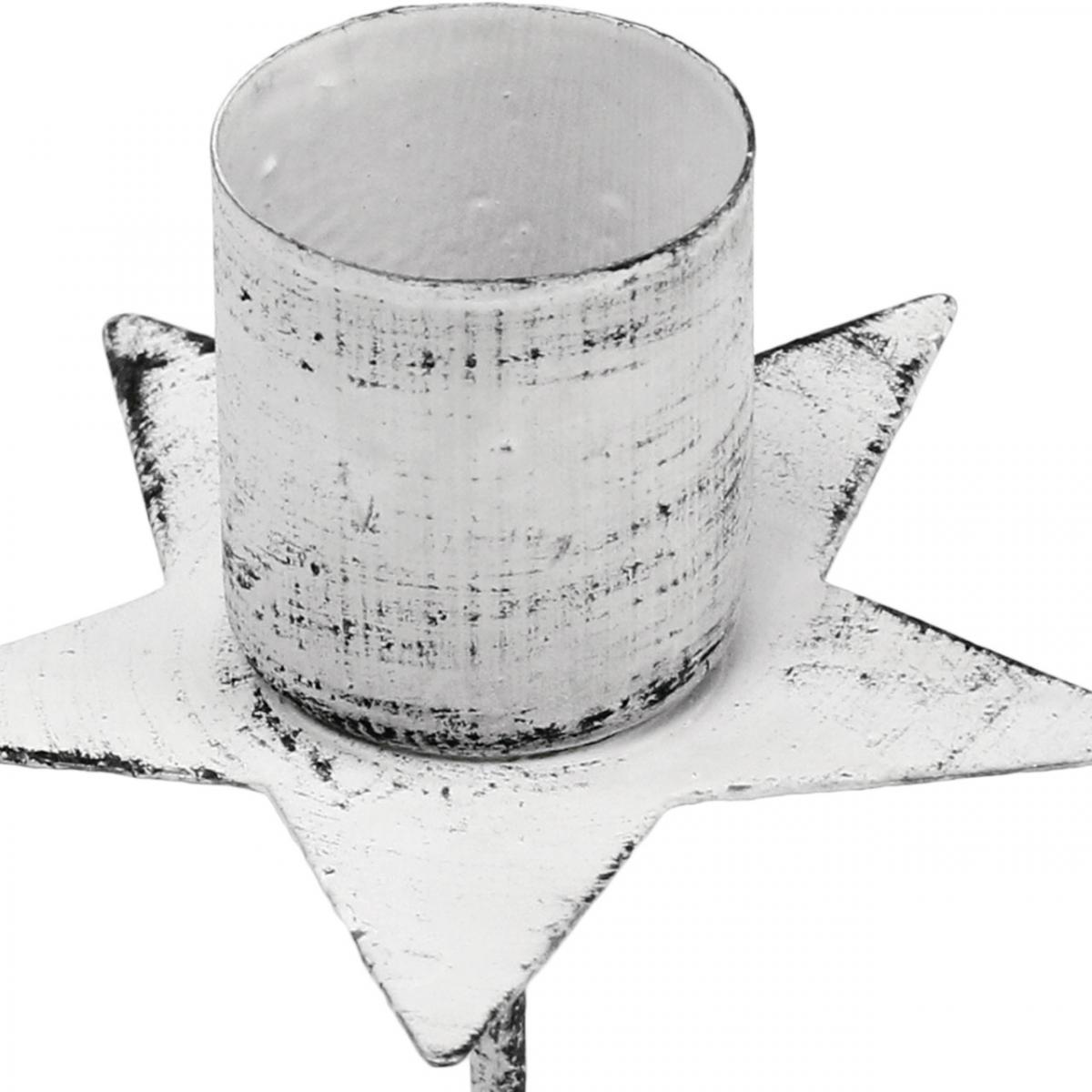 Deze ster is niet alleen decoratief, maar is ook een veelzijdige, taps toelopende kaarsenhouder voor uw Adventsdecoraties!De witte metalen kaarsenhouder heeft een trendy shabby chic design en past perfect bij natuurlijke, landelijke kerstversieringen. Dankzij de lange houder met spikes is de kaarsenhouder gemakkelijk in steekschuim of strokransen te plaatsen. De kaarsenhouder kan ook in met aarde of decoratief zand gevulde potten worden geplaatst, waardoor een ster ontstaat.