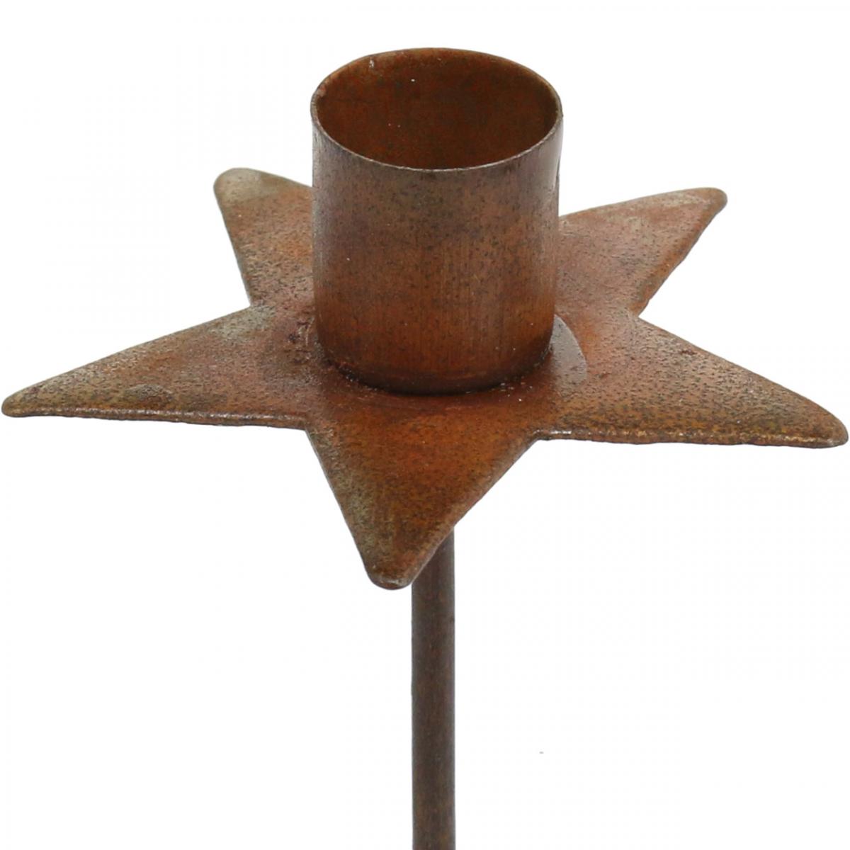 Deze mooie stervormige kaarsenhouder is een veelzijdige kaarshouder voor in de vorm van een boom. Deze feestelijke kerstversiering, gemaakt van metaal met een rustieke roestafwerking, is eenvoudig te plaatsen met de lange prikker. Zo verlicht u direct bloemstukken of kransen voor uw adventsdecoraties met piramide- of boomkaarsen met een diameter tot 1,2 centimeter. Indien nodig kunt u de kaarsen iets scherper maken voor een betere pasvorm.Combineer de stervormige kaarsenhouders met de antiekwitte uitvoering of met kandelaars voor kaarsen uit ons uitgebreide assortiment kaarsenhouders.