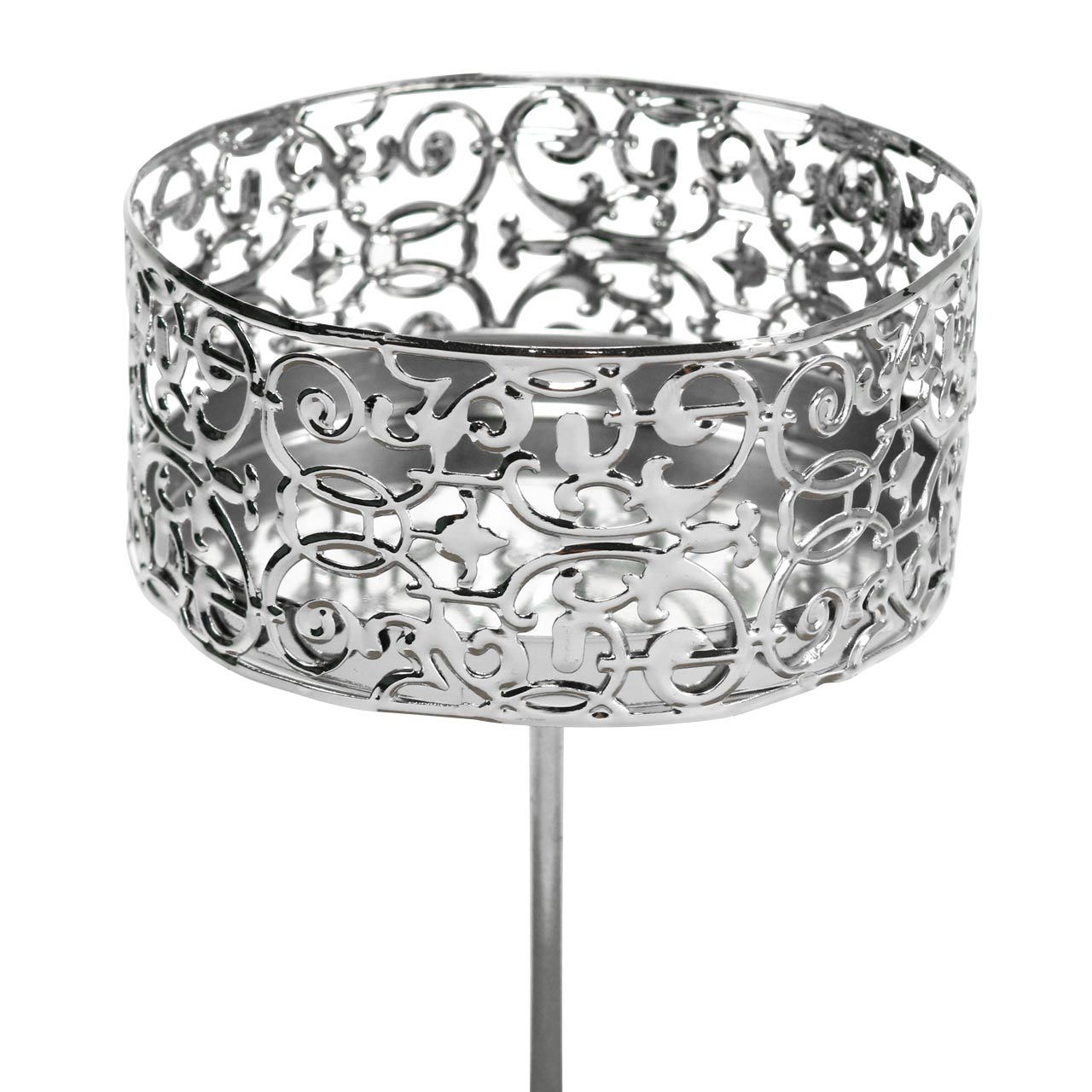 Diese Kerzenhalter zum Stecken erinnern mit ihrer filigranen Verzierung an orientalische Windlichter. – Rundum besitzt jeder der Kerzenleuchter ein ansprechendes gestanztes Muster in floraler Rankenoptik.Stecken Sie die vier Kerzenhalter aus silberfarbenem Metall mit dem langen Dorn bequem in Styropor, einen Strohring oder in Erde. Die hübschen Kerzenhalter laden zum vielfältigen kreativen Gestalten von Gestecken und Kränzen ein. Besonders als romantische Hochzeitsdekoration und zum Dekorieren in der Vorweihnachtszeit eignen sich die Leuchter sehr gut!