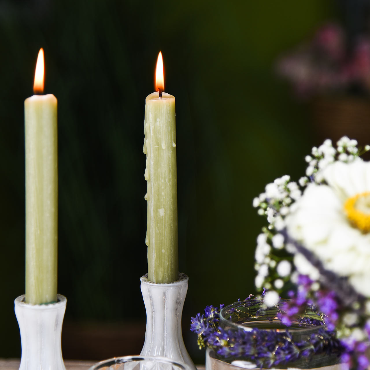 Die Stabkerzen in Grün bringen Licht und Farbe in Ihre Tischdeko! Die Wachskerzen mit dem durchgehenden Docht haben eine Brenndauer von circa 6 Stunden und sind durchgefärbt. Durch die etwas rustikalere Oberfläche entsteht dabei der Eindruck, dass die Premiumkerzen leicht marmoriert seien.Das helle Olivgrün macht insbesondere im Zusammenspiel mit Naturdeko einen sehr natürlichen Eindruck. Selbstverständlich sollten Sie die Kerzen immer im sicheren Abstand von allen brennbaren Materialien, im sicheren Kerzenhalter oder in einem Glas aufstellen. Die Wachskerzen sehen mit dunklem Holz oder gelben Blüten unglaublich stimmungsvoll aus. Doch auch in der Kombination mit Rot als Weihnachtsdeko erzielen die Deko-Kerzen einen schönen Farbeffekt. Dieser ökologische Eindruck spiegelt sich auch in der plastikfreien Verpackung der Kerzen wieder.