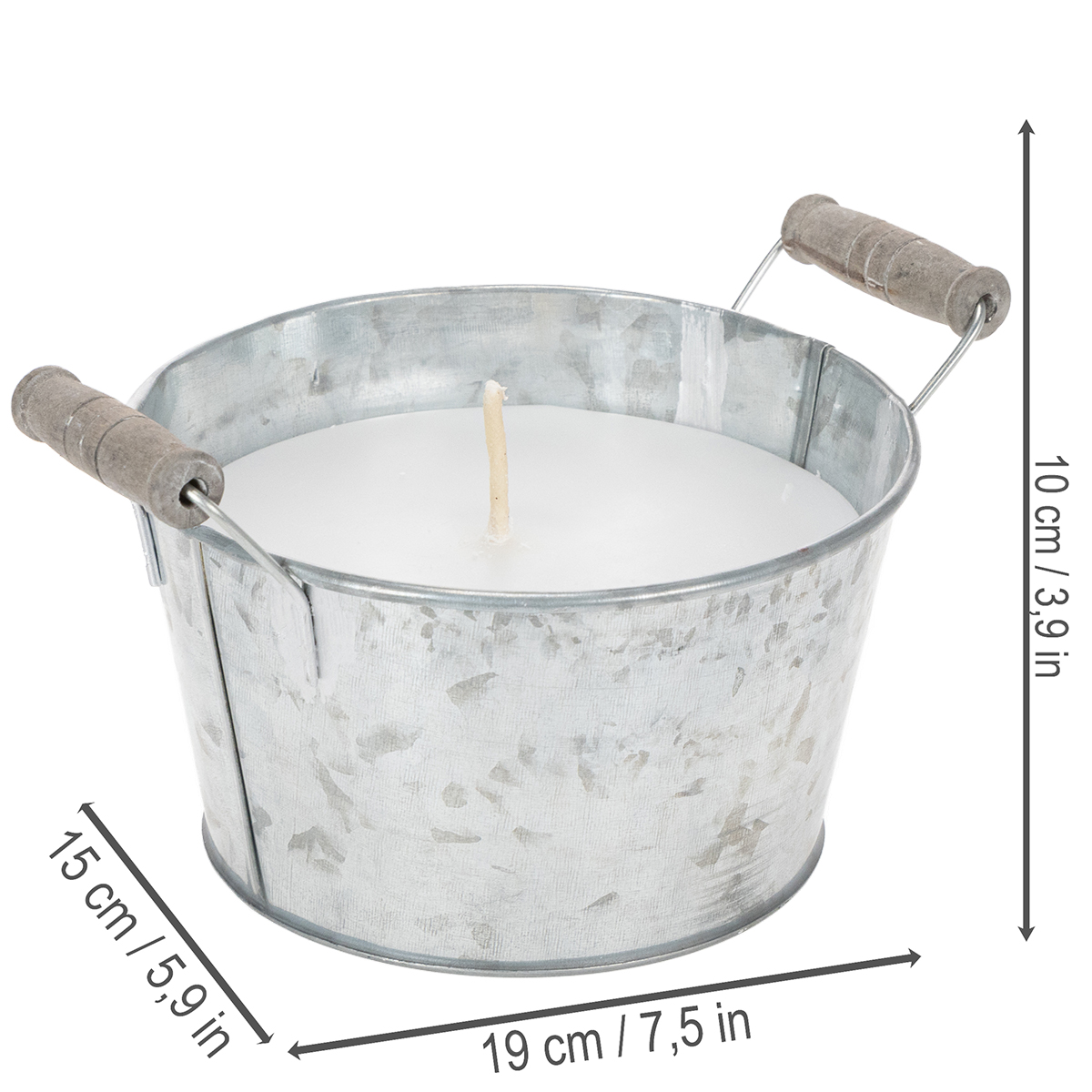 Ein lauer Sommerabend im Garten, das sanfte Flackern des Kerzenlichts und eine Atmosphäre, die zum Träumen einlädt – genau das schafft unsere Kerze im Zinkeimer! Dank ihrer schlichten, aber stilvoll rustikalen Optik wird diese Kerze zum Highlight Ihrer Außenbereiche. Ob Terrasse, Balkon oder Garten – der Zinkeimer mit seinen rustikalen Holzgriffen fügt sich harmonisch in jede Umgebung ein. Gefertigt aus hochwertigem Wachs in klassischem Weiß, sorgt die Wachskerze für eine romantische Beleuchtung mit einer Brenndauer von 30 Stunden. Nutzen Sie diese charmante Gartenkerze sowohl für entspannte Stunden auf der Terrasse als auch als Dekoration für Gartenpartys. Der Zinkeimer ist robust und lässt sich problemlos sowohl drinnen als auch in Außenbereichen verwenden. Verleihen Sie Ihren Sommerabenden das gewisse Etwas!