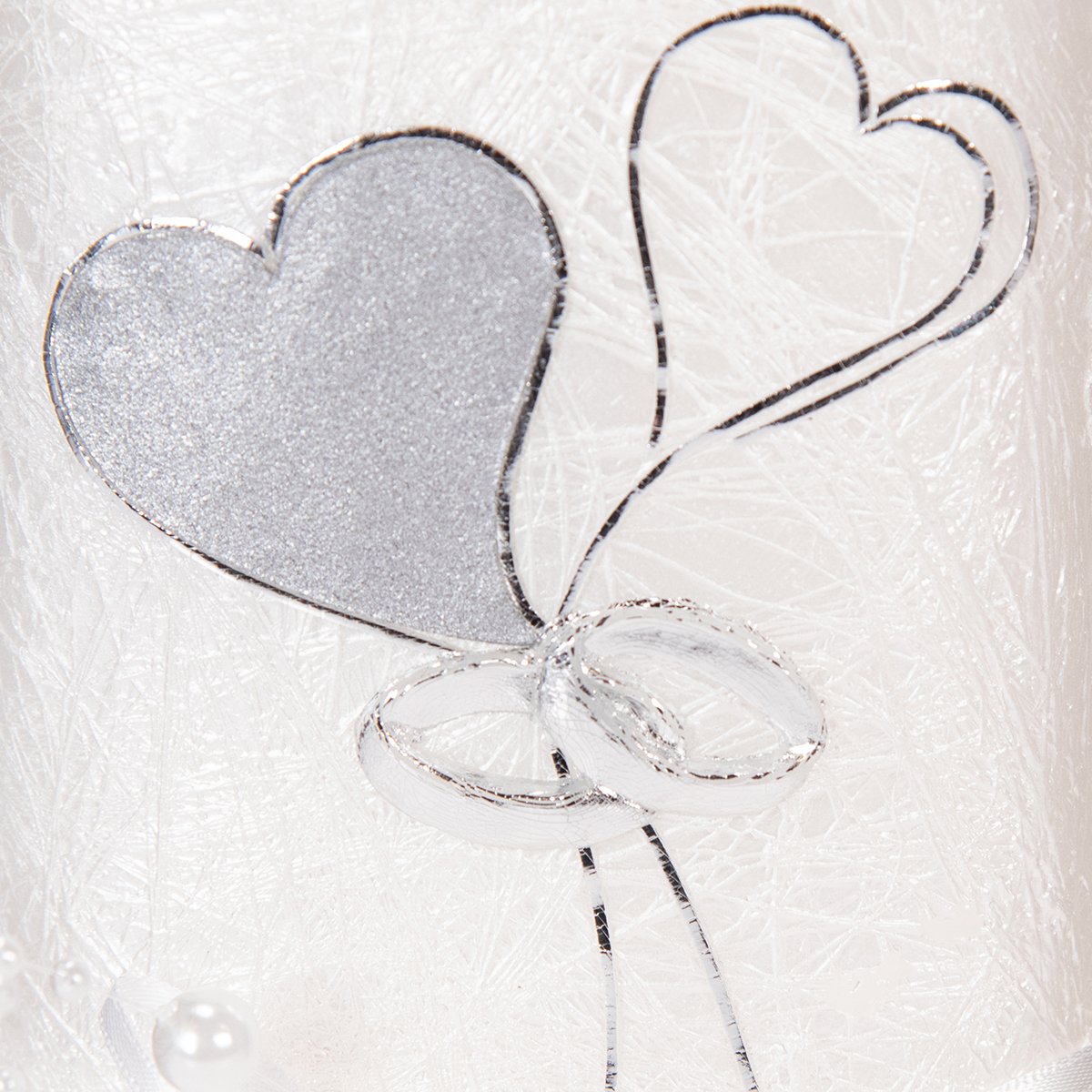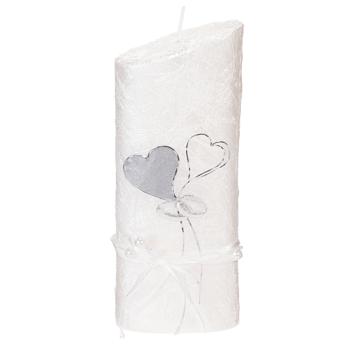 Deze elegant glinsterende witte trouwkaars vormt de perfecte aanvulling op uw tafeldecoratie! Omdat het ontwerp met de ringen en hartjes zilverkleurig is, is deze kaars ook ideaal voor een zilveren huwelijksjubileum.