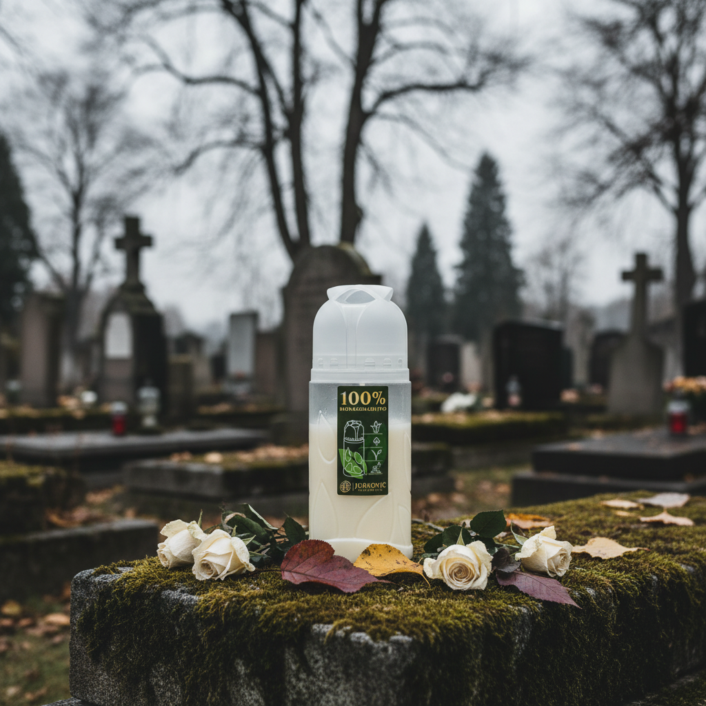Das Besondere an dieser Grabkerze ist ihr transparenter Mantel aus 100 Prozent kompostierbarem Kunststoff, was die Kerze zum umweltfreundlichen Weggefährten für jedes Grab macht. Das Siegel ICP bestätigt, dass die Kerze industriell kompostierbar ist und somit Ihrem Wunsch nach einem nachhaltigen Leben, auch im Andenken, entspricht.