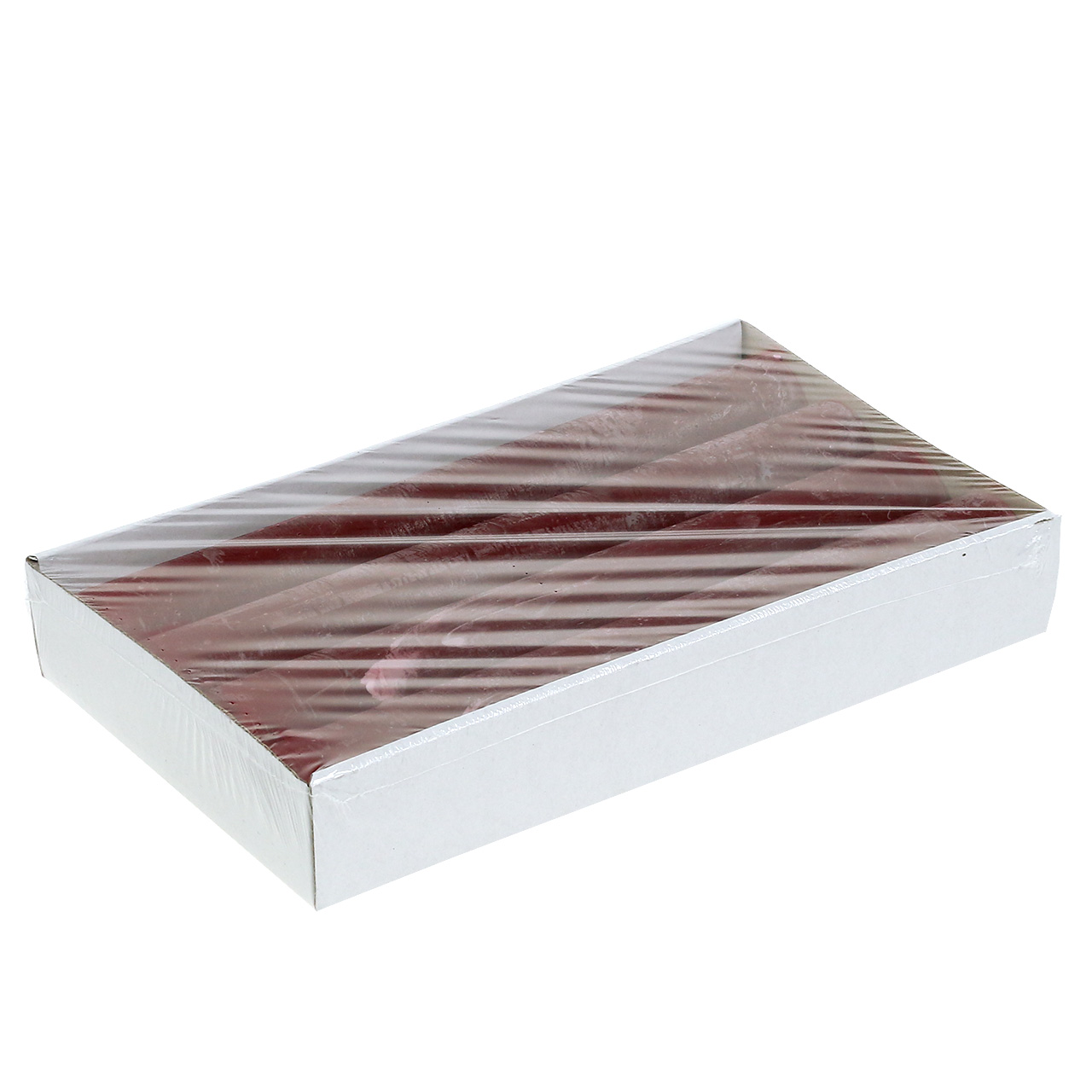 Bei diesen durchgefärbten Stabkerzen in Dunkelrot handelt es sich um hochwertige Qualitätsprodukte, die sich durch viele tolle Eigenschaften auszeichnen: Mit ihrer trendigen, marmorierten Oberfläche, dem durchgängigen, eingegossenen Docht und der Tatsache, dass kaum Lufteinschlüsse im Material vorhanden sind, sind die recht schweren, schicken Deko-Kerzen vielseitig einsetzbar! Nutzen Sie die Wachskerzen für Adventsgestecke für Ihre Kunden, auf opulenten Kerzenleuchtern in Eingangsbereichen und Hotellobbys sowie für kreative Tischdekorationen das ganze Jahr über!Geliefert werden Ihnen hier 4 Stück der durchgefärbten, dunkelroten Stabkerzen in einer Verpackung aus Pappe und Kunststoff. Die circa 240 Millimeter großen Kerzen mit einem ungefähren Durchmesser von 34 Millimetern verfügen über eine Brenndauer von etwa 24 Stunden.