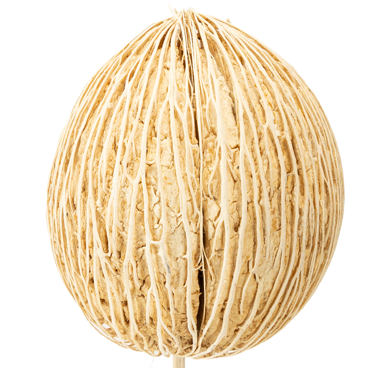 Ergänzen Sie eine Raumdekoration mit diesem gebleichten Mintolla Ball, der sich auf einem langen Stiel befindet! Hierbei handelt es sich um die Samen des Zerberusbaumes, der auch unter dem Namen Cerbera odollam bekannt ist. Die eiförmigen und verholzten Baumsamen besitzen eine feine Faserstruktur an der Oberseite, die die exotische Ausstrahlung der Deko-Samen noch ausbaut. Mit dem langen Holzstiel, auf dem die runde Trockenpflanze angebracht ist, können Sie den Ball prima in Steckmasse, Styropor und Stroh einarbeiten.Damit können Sie dann Gestecke aller Art verzieren und von einer Trauerdekoration bis hin zu einer sommerlichen Schaufensterdeko diese Deko-Bälle dafür verwenden. Außerdem können Sie die Mintolla Bälle mit dem langen Stiel in eine Vase stellen und damit einen Blumenstrauß oder auch Kunstblumen unterstützen. Durch die schöne runde Form und die helle Farbe bringt der Ball eine eigene Note mit hinein, die sehr angenehm und abwechslungsreich wirkt.