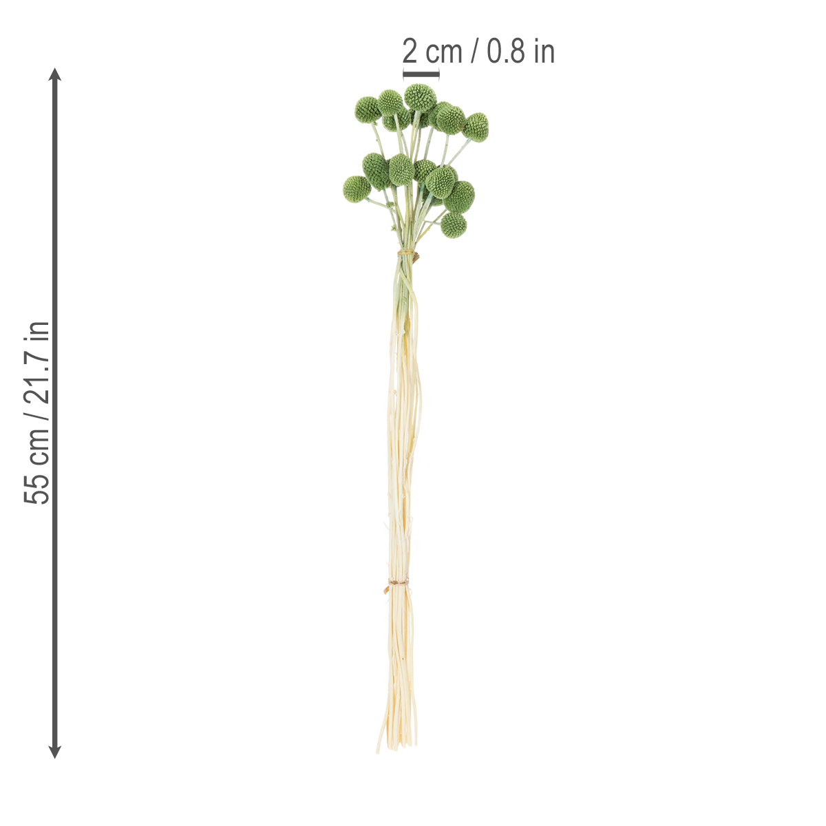Die dekorativen Craspedia-Kugeln bezaubern durch ihre natürliche grüne Farbe und die charakteristische Kugelform. Diese Trockenblumen passen hervorragend zu modernen Herbstdekorationen und lassen sich besonders schön in Wohnräumen, Schaufenstern oder auf festlichen Tafeln arrangieren. Ihre naturfarbenen Stiele und die robusten getrockneten Köpfe (Durchmesser 2-3 cm) machen sie pflegeleicht – eine Reinigung ist kaum nötig, einfach sanft abstauben.