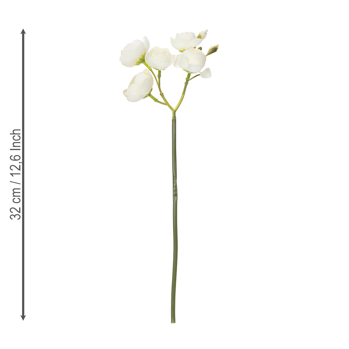 Envie d'une touche printanière toute l'année ? Pourquoi pas ! Ce bouquet de renoncules artificielles d'un blanc éclatant apporte une élégante décoration florale à votre intérieur. Elles ne fanent jamais et ne nécessitent aucun entretien. Idéales dans le salon, sur un rebord de fenêtre ou comme élément décoratif original au bureau, ces renoncules artificielles de 32 cm de haut, composées de cinq tiges, offrent un rendu authentique, presque indiscernable de vraies fleurs. Elles sont parfaites pour tous ceux qui apprécient le charme naturel des renoncules et recherchent une beauté durable. Un véritable atout décoratif, suffisamment polyvalent pour s'intégrer à tous les styles de décoration.