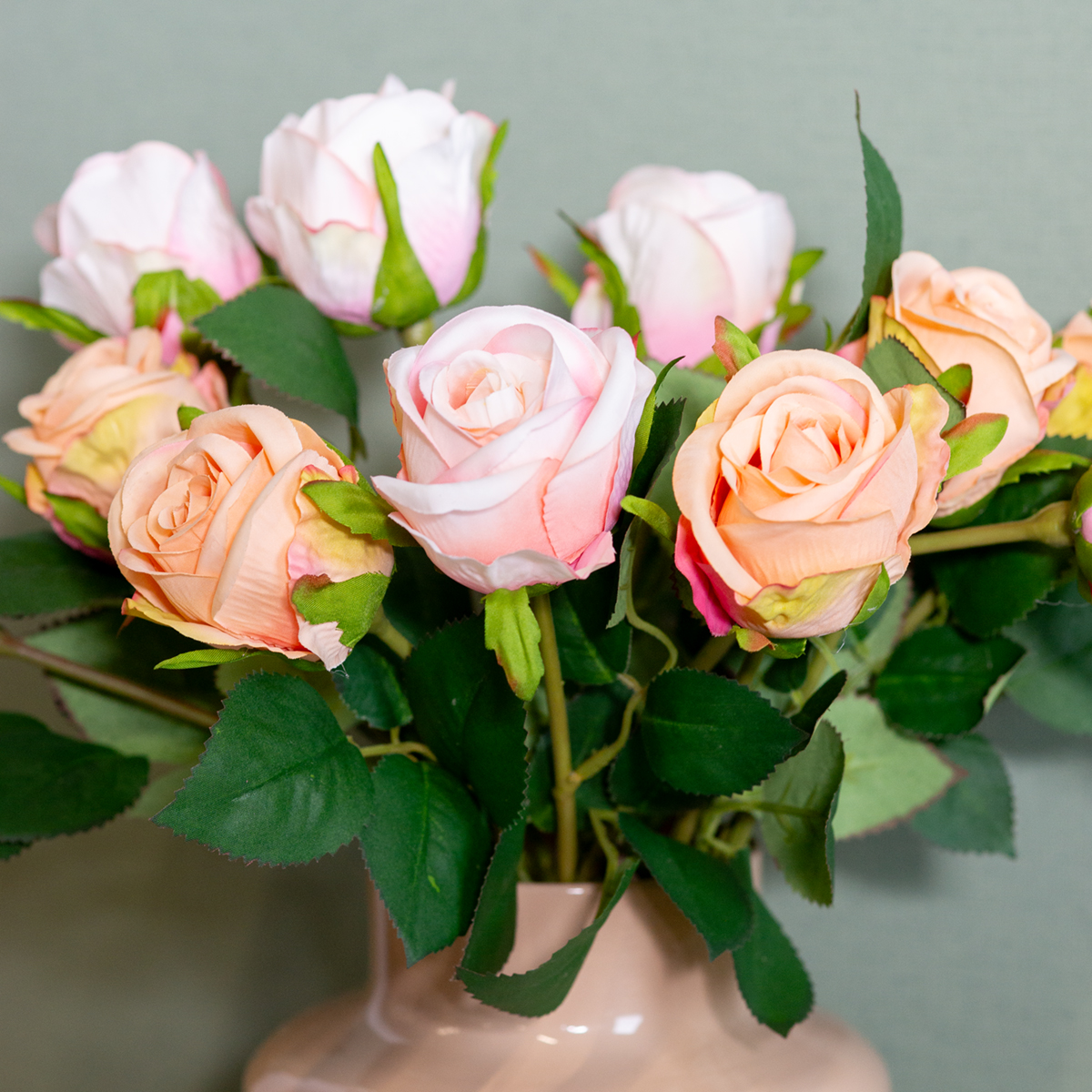 - Couleur : Rose pâle avec des feuilles vertes réalistes