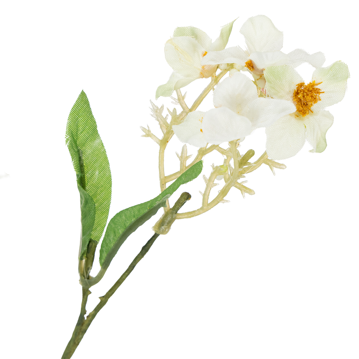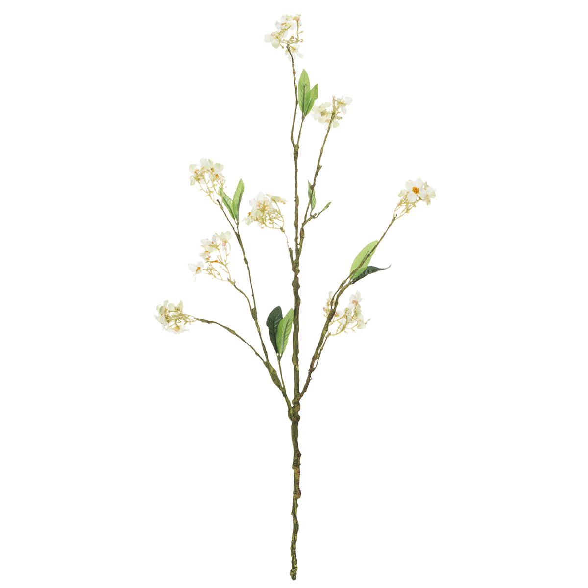 La branche fleurie mesure environ 65 centimètres de long et se ramifie à partir de sa tige principale verte en plusieurs branches, grandes et petites. La tige et les petites branches sont en plastique et présentent un aspect légèrement ossifié, car elles présentent de nombreuses petites bosses et filaments, tout comme leurs homologues naturels. Les petites fleurs blanches ouvertes présentent encore des grappes de pollen jaune au centre et de petites perles représentant les fleurs fermées, ce qui laisse présager une belle et abondante récolte de pommes.