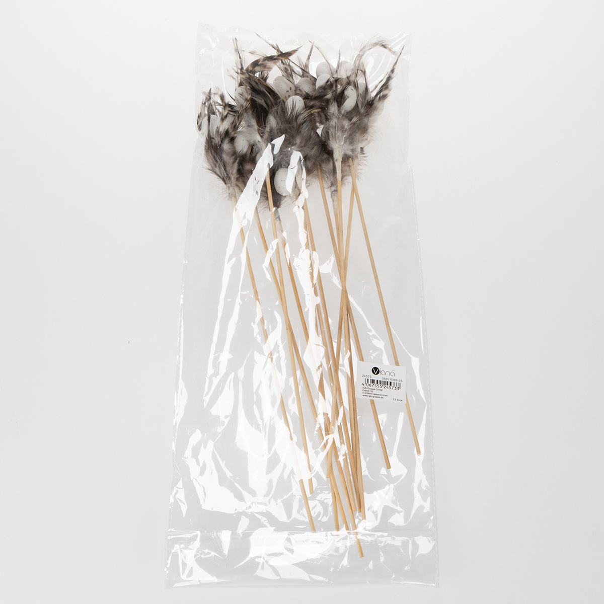 - Materiaal: Houten stokje met natuurlijke veren en kleine plastic eitjes