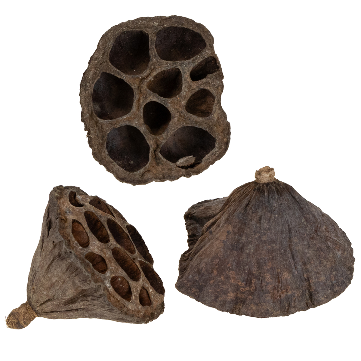 Nos fruits de lotus de forme conique ont été séchés mais peuvent encore renfermer quelques graines. Ils sont livrés en sachet plastique contenant 100 pièces et s’agissant d’un produit d’origine naturelle, ils vous sont proposés dans différentes tailles. Leur longueur peut de ce fait aller de 3,5 à 7cm et leur diamètre atteint 3 à 6 cm.