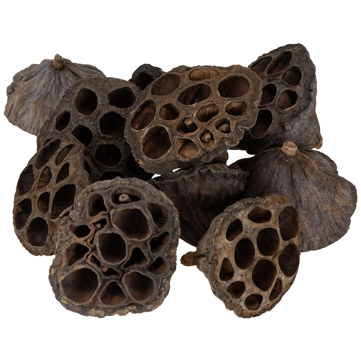 De conisch gevormde lotusflessen zijn gedroogd, maar sommige bevatten nog steeds de zaden en zitten in totaal 100 stuks in een plastic zak. Omdat dit natuurlijke producten zijn, kunnen de maten variëren. De capsules zijn ongeveer tussen de 3,5 en 7 centimeter lang en hebben elk een diameter van 3 tot 6 centimeter.