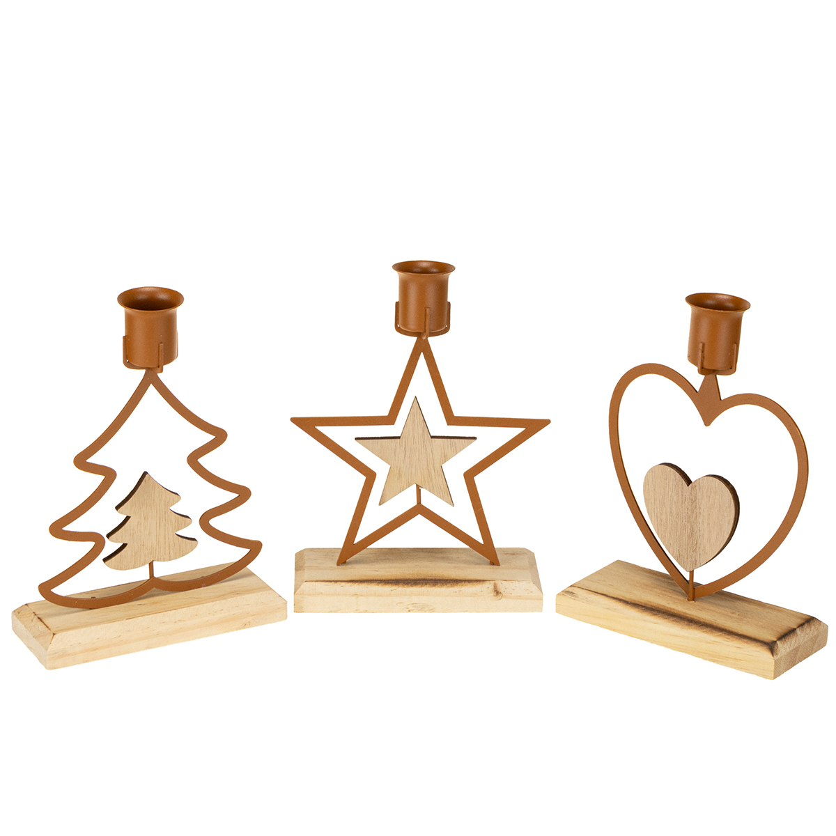 Nom du produit : Chandelier bougies étoile coeur sapin marron H16,5cm assorties 3pcs