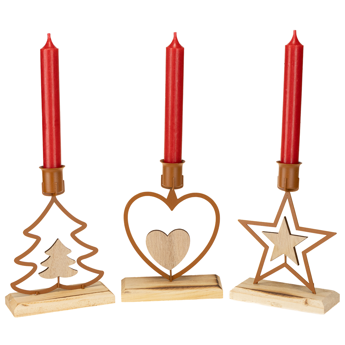 Die Kerzenhalter für Stabkerzen mit dem gewissen Etwas: Die Metall-Deko rückt Kerzen nicht nur auf dem Tisch ins rechte Licht. Drei weihnachtliche Motive sorgen für Abwechslung. Stern, Herz und Tannenbaum sind die Themen des rost-braunen Kerzenhalter-Trios.Die Silhouette aus rostbraun lackiertem Metall mit dem Kerzenhalter für Stabkerzen sitzt auf einem dezent geflammten Sockel in Naturholz. In der Mitte unter dem Kerzenständer sind Stern, Herz und Tannenbaum nochmals als Motive aus Holz zu sehen.