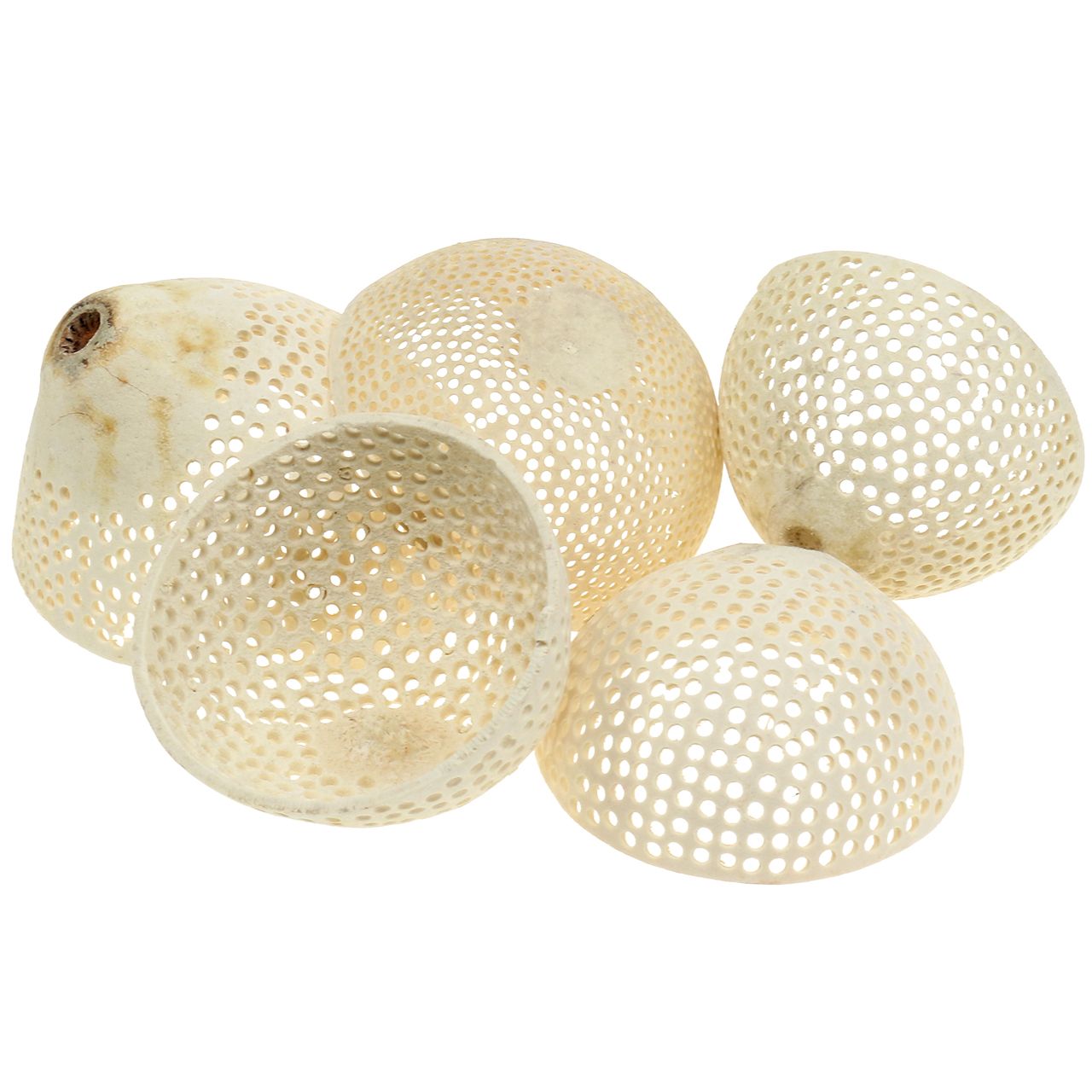 Floristen und Kreative aufgepasst: mit Trockenfrüchte wie diesen gebleichten Bell Cups lassen sich einzigartige Deko-Ideen verwirklichen.Das Naturprodukt wurde gewonnen aus der Fruchtschale der in Indien beheimateten Bengalischen Quitte und ist unter zahlreichen weiteren Namen bekannt, darunter Bell Male, Belbaum oder botanisch: Aegle marmelos. Ihre außergewöhnliche Optik erhält die Deko-Frucht durch Verholzung und eine sanfte Verarbeitung. Die kleinen Löcher etwa werden sacht in die Halbkugel gebohrt, die Oberfläche sanft gebleicht, um die natürliche Erscheinung zu bewahren.