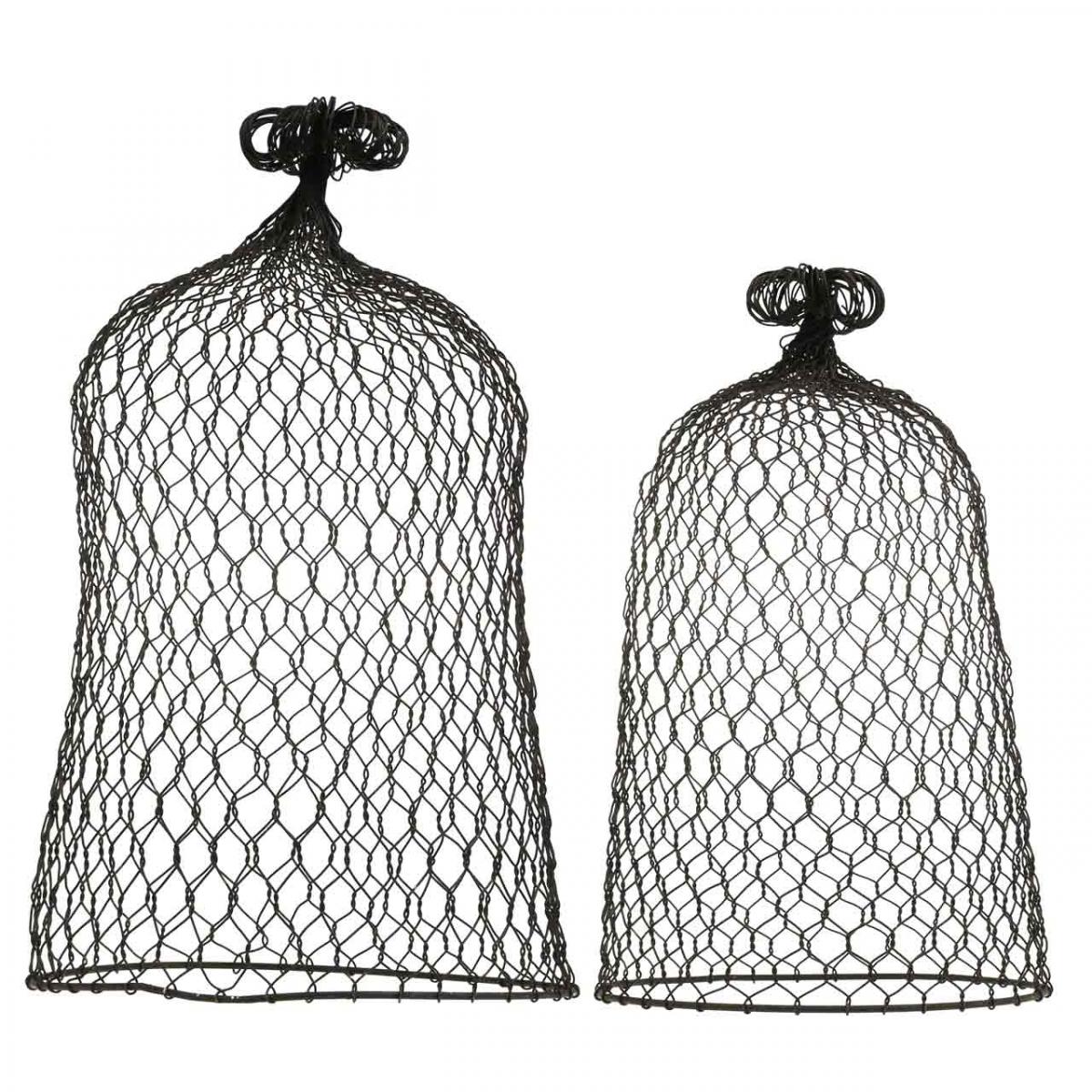 Réalisé en fil de métal brun foncé et légèrement patiné par endroits, le lot de deux cloches en métal se décline en deux tailles et dispose également d'une anse pour le soulever.