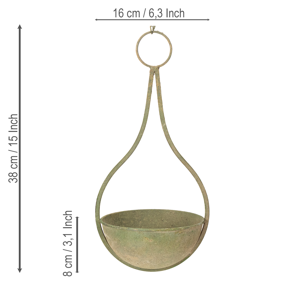 Deze rustieke hangmand in grijs-groen is een prachtige metalen decoratie voor in de tuin. De veelzijdige hanging basket kan ook heerlijk gebruikt worden op je balkon, terras of binnenshuis.De metalen hangende mand bestaat uit een ronde kom die wordt vastgehouden door een cirkelvormige boog die naar boven toe convergeert.