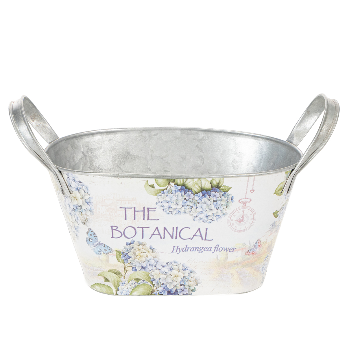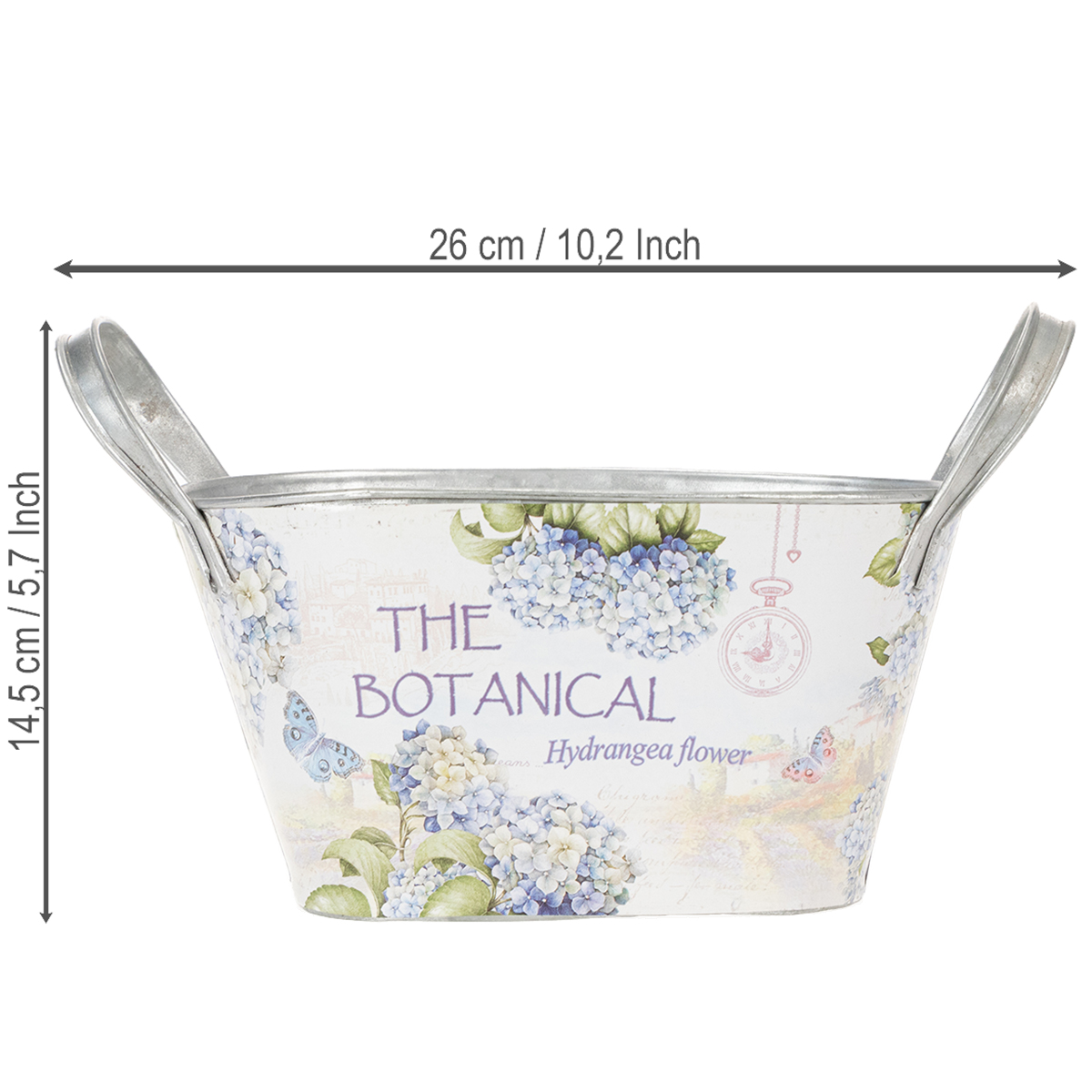 Le bol à fleurs ovale avec poignées est une façon charmante d'égayer votre été avec des décorations en métal élégantes ! L'imprimé avec des hortensias bleus transmet la sensation des journées chaudes dans le jardin.