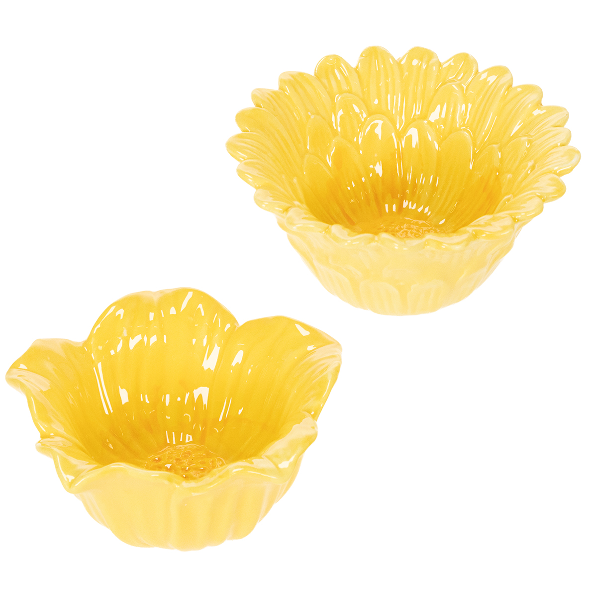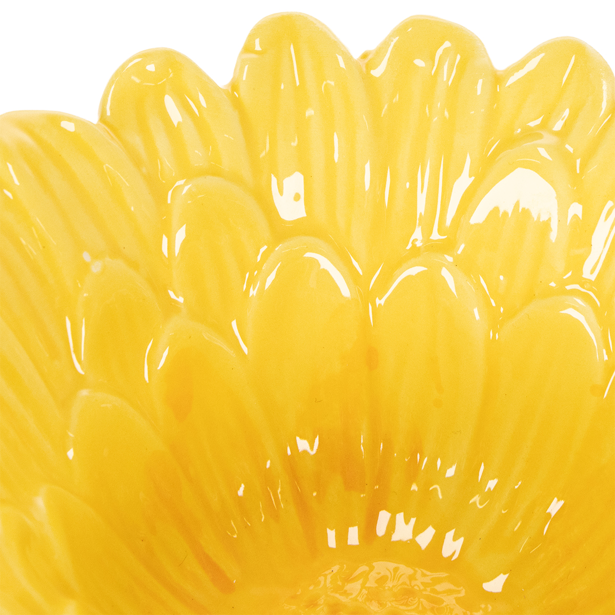 Die Blumenschalen bestechen durch ihre aufwendige, florale Formgebung, die an eine aufgeblühte Blume erinnert. Das glänzende Gelb der Keramik sorgt dabei für eine warme und freundliche Atmosphäre, die ideal in viele Wohnungsdesigns passt – ob moderner Wohnstil, Retro-Flair oder sogar als Highlight in einem Japandi-Setting. Die präzise Verarbeitung der Schalen unterstreicht ihre elegante Optik, während ihre Maße handlich genug sind, um sie flexibel einzusetzen: Mit einem Durchmesser von 13 cm gelingt es, sie überall harmonisch zu integrieren.