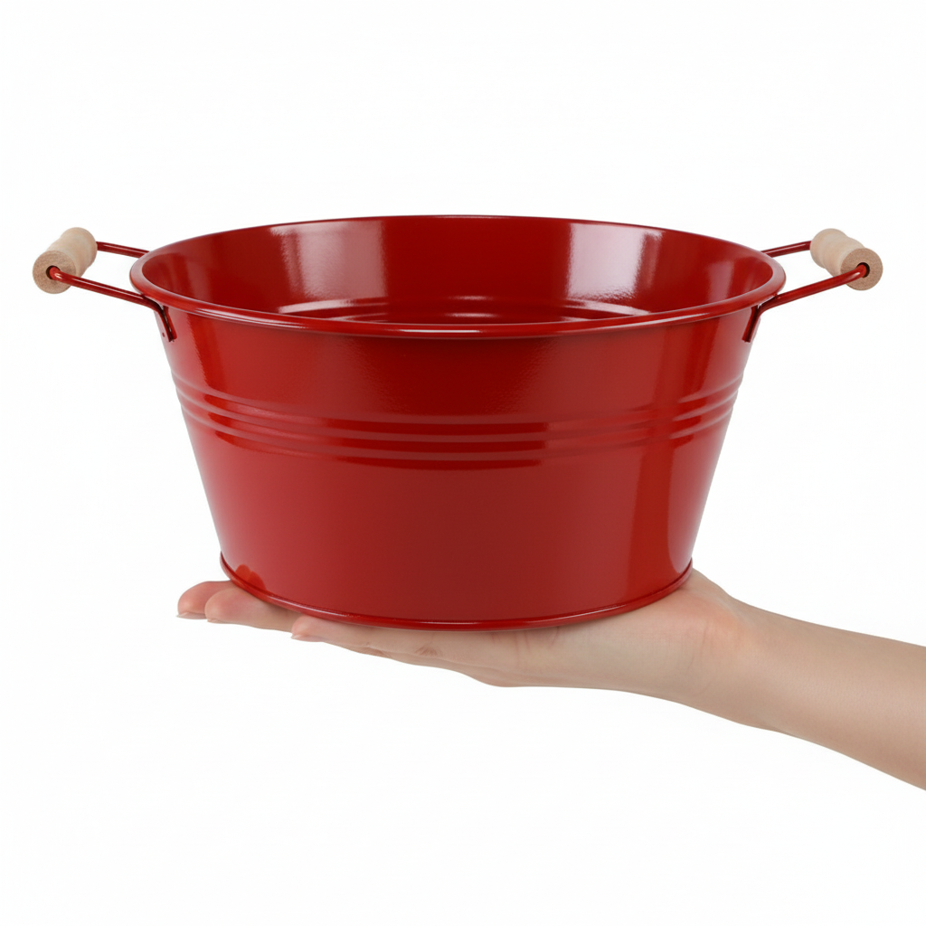 Ce bol à fleurs brille du plus beau rouge. La forme classique est perfectionnée par les poignées en bois véritable. La décoration en métal semble harmonieuse et nostalgique.
