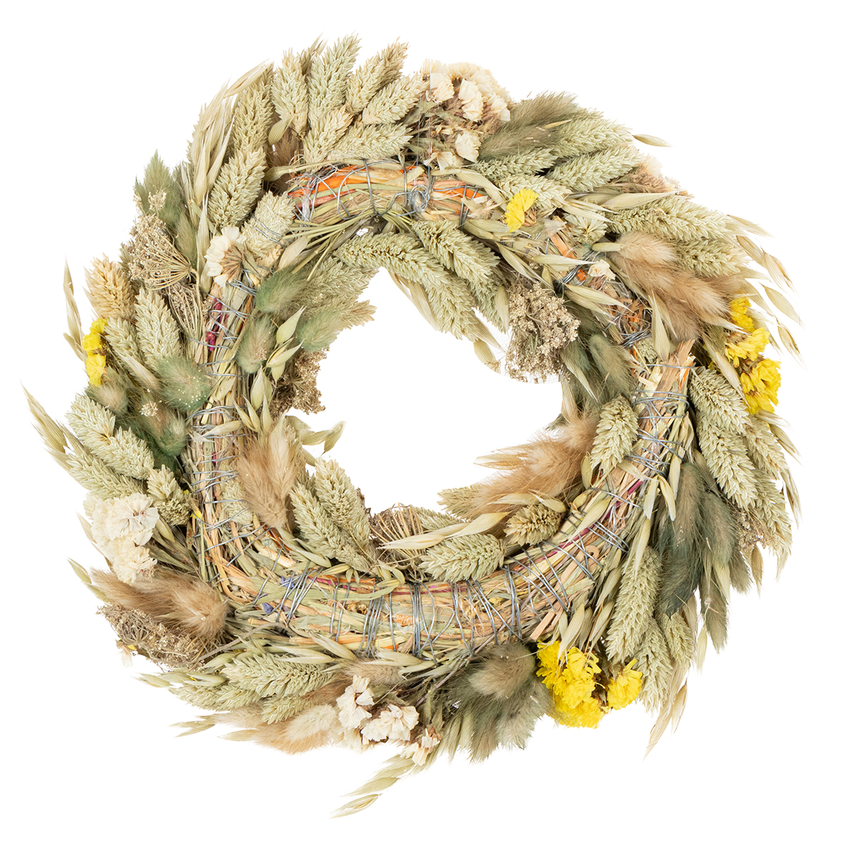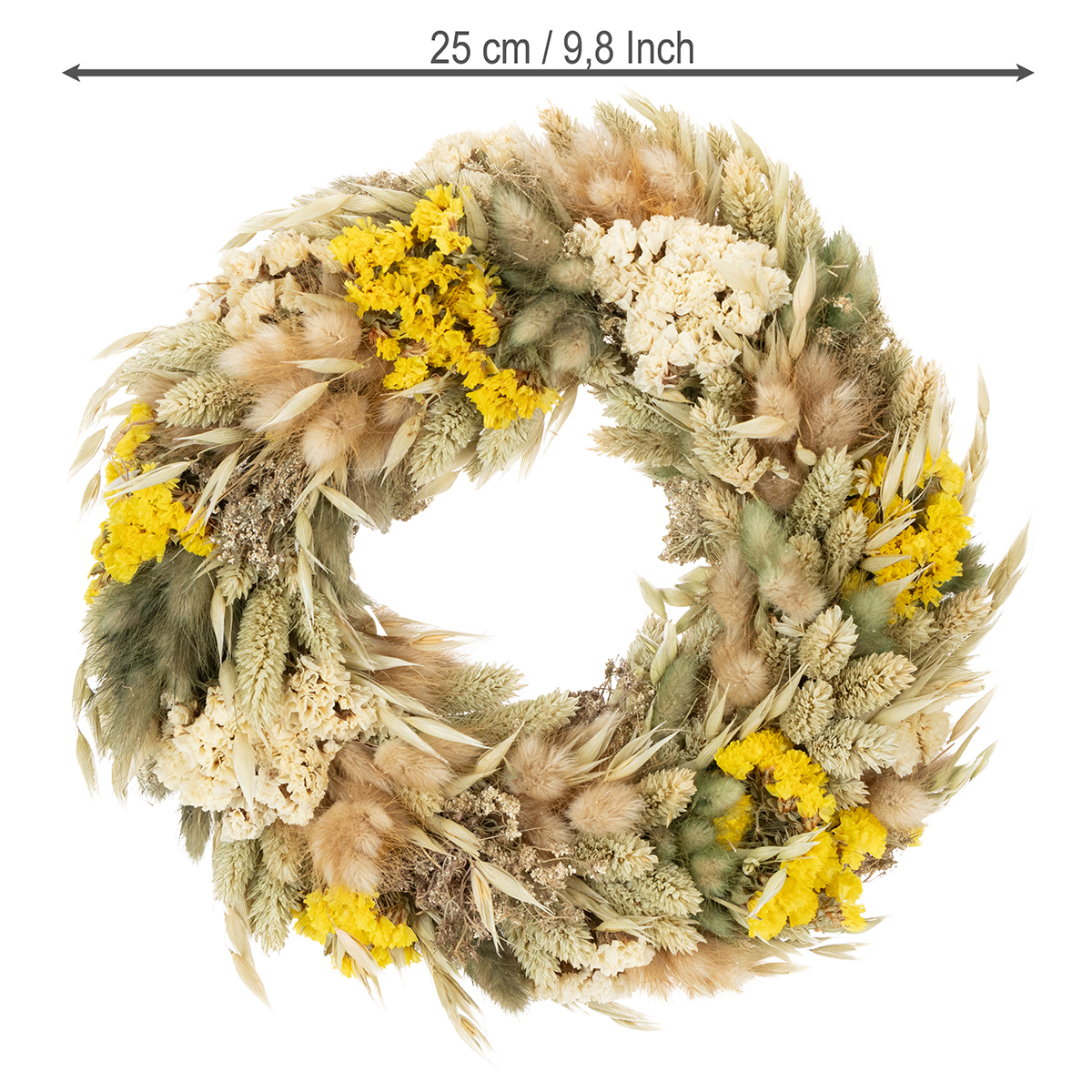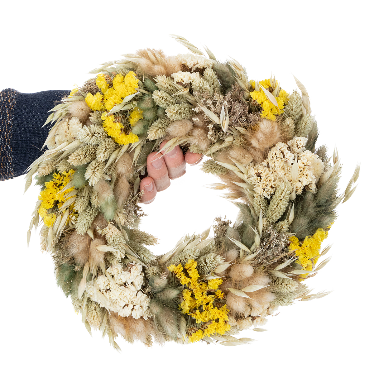 Dank der natürlichen Materialien strahlt der Kranz aus Trockenblumen eine Leichtigkeit aus, die in Kombination mit Blumen in Beige- und Gelbtönen ein harmonisches Gesamtbild ergibt. Er ist pflegeleicht, langlebig und behält seine wunderschöne Optik über die Jahreszeiten hinweg. Zur Reinigung reicht es, den Kranz gelegentlich mit einem weichen Staubpinsel vorsichtig abzustauben.