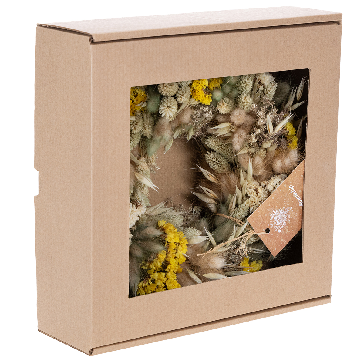 Dankzij de natuurlijke materialen straalt de gedroogde bloemenkrans een lichtheid uit die, in combinatie met de bloemen in beige en gele tinten, een harmonieus geheel vormt. De krans is gemakkelijk te onderhouden, duurzaam en behoudt zijn mooie uiterlijk gedurende alle seizoenen. Om hem schoon te maken, volstaat het om de krans af en toe af te stoffen met een zachte stofborstel.