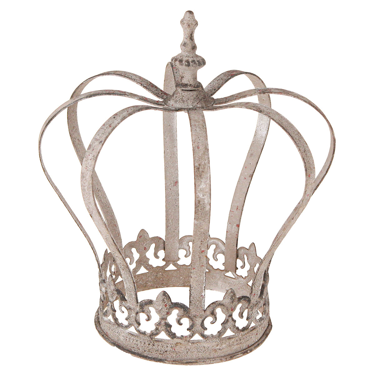 Met deze decoratieve kroon kent u geen grenzen aan uw creatieve ideeën. De metalen kroon is grijs gewassen en op sommige plaatsen versierd met roestkleur, wat hem een vleugje vintage geeft en perfect past bij de trendy shabby chic stijl. De licht gebogen balken eindigen in een fleur-de-lys, vroeger het wapen van de Franse koningen.Plaats de charmante kroon op een decoratief bord bedekt met mos en schik er rozenblaadjes en kleine kiezels omheen. De romantische vintage sfeer zou compleet zijn!