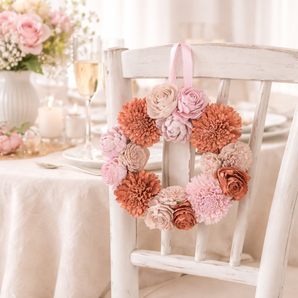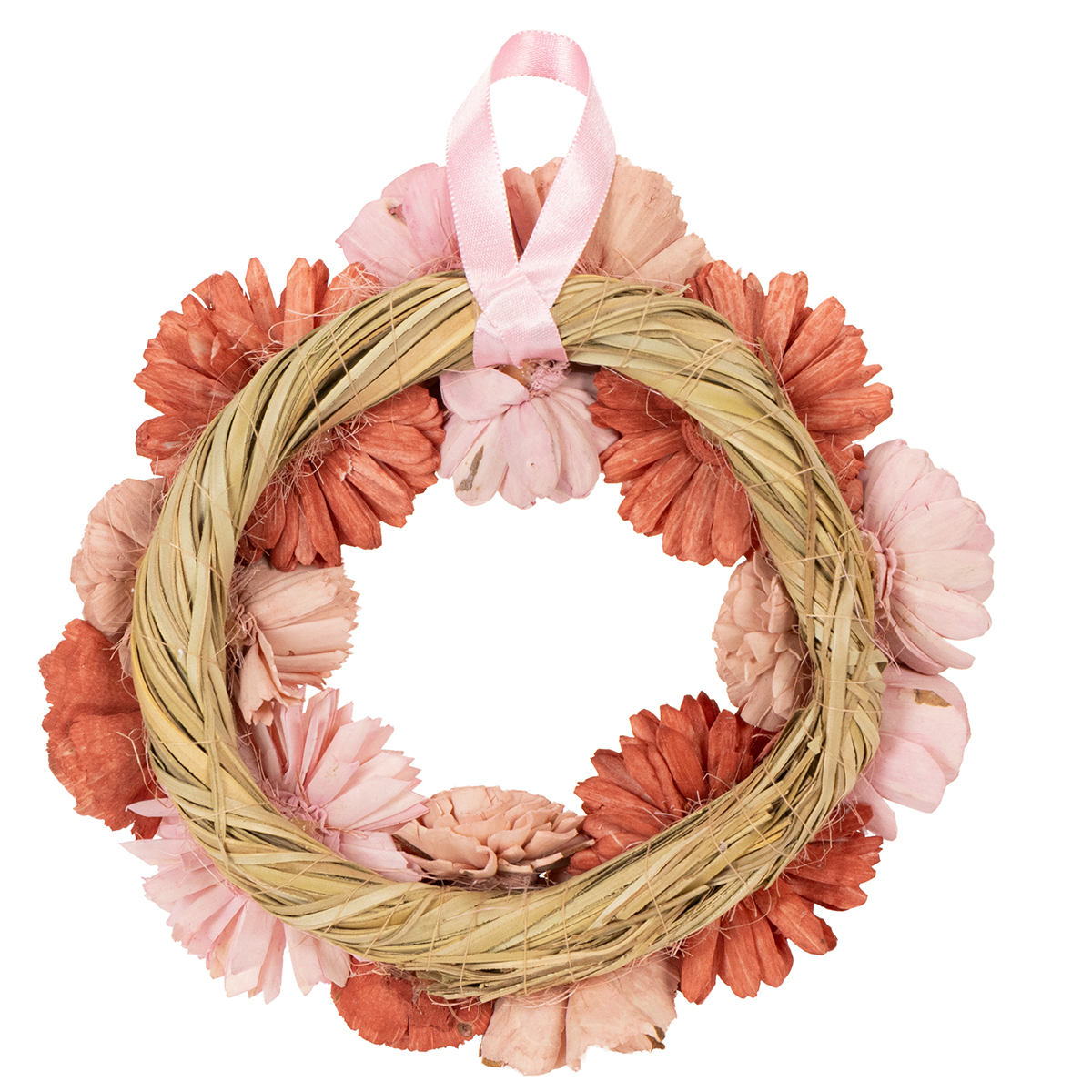 Cette couronne de fleurs séduit au premier regard par son harmonieux camaïeu de rose délicat. Les fines fleurs, soigneusement confectionnées en bois de sola de haute qualité, dégagent un charme à la fois réaliste et unique qui apportera une joie durable. Suspendues, les couronnes de fleurs comme celle-ci sont parfaites pour décorer un mur de salon ou une table lors d'occasions spéciales. Elles deviendront sans aucun doute la pièce maîtresse de votre mariage ou d'un brunch printanier.