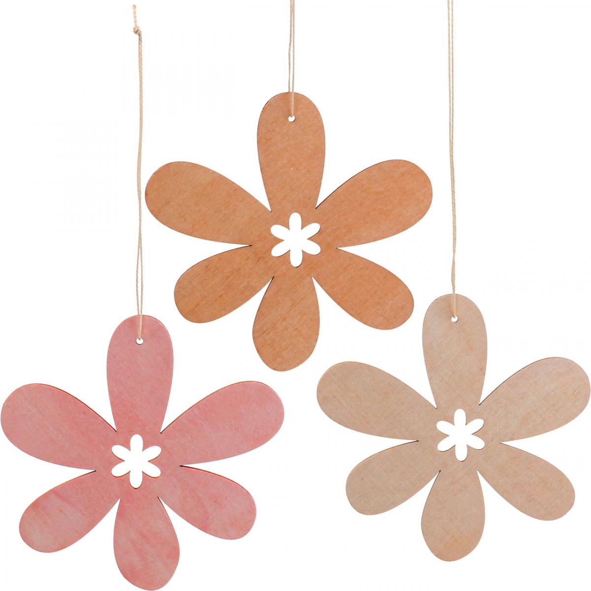 Deco bloem houten hanger houten bloem oranje/roze/geel 12 stuks