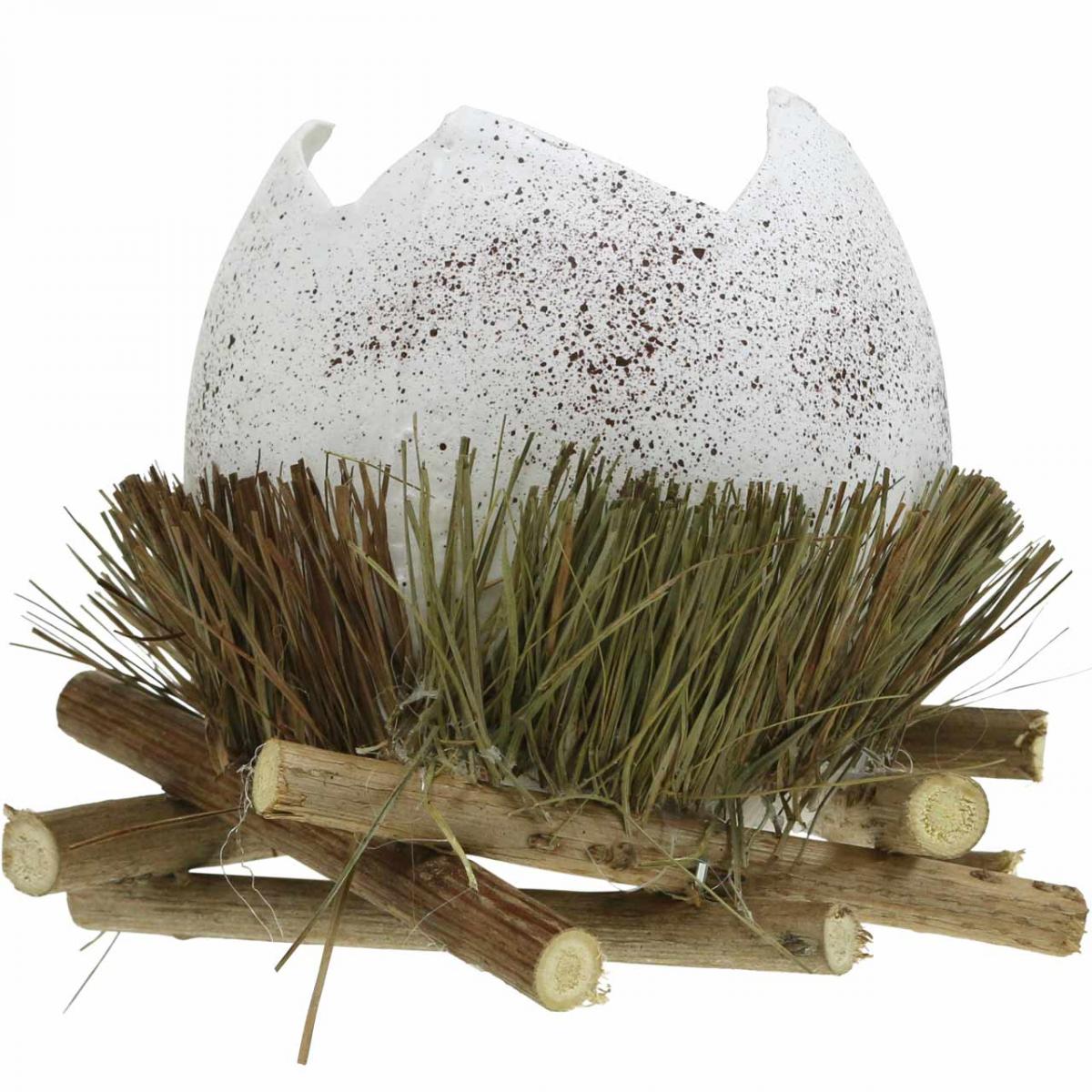 Paasdecoratie, ei in een nest, decoratief ei, vogelnest Ø9cm H10cm Wit, natuurlijke kleuren 4 stuks