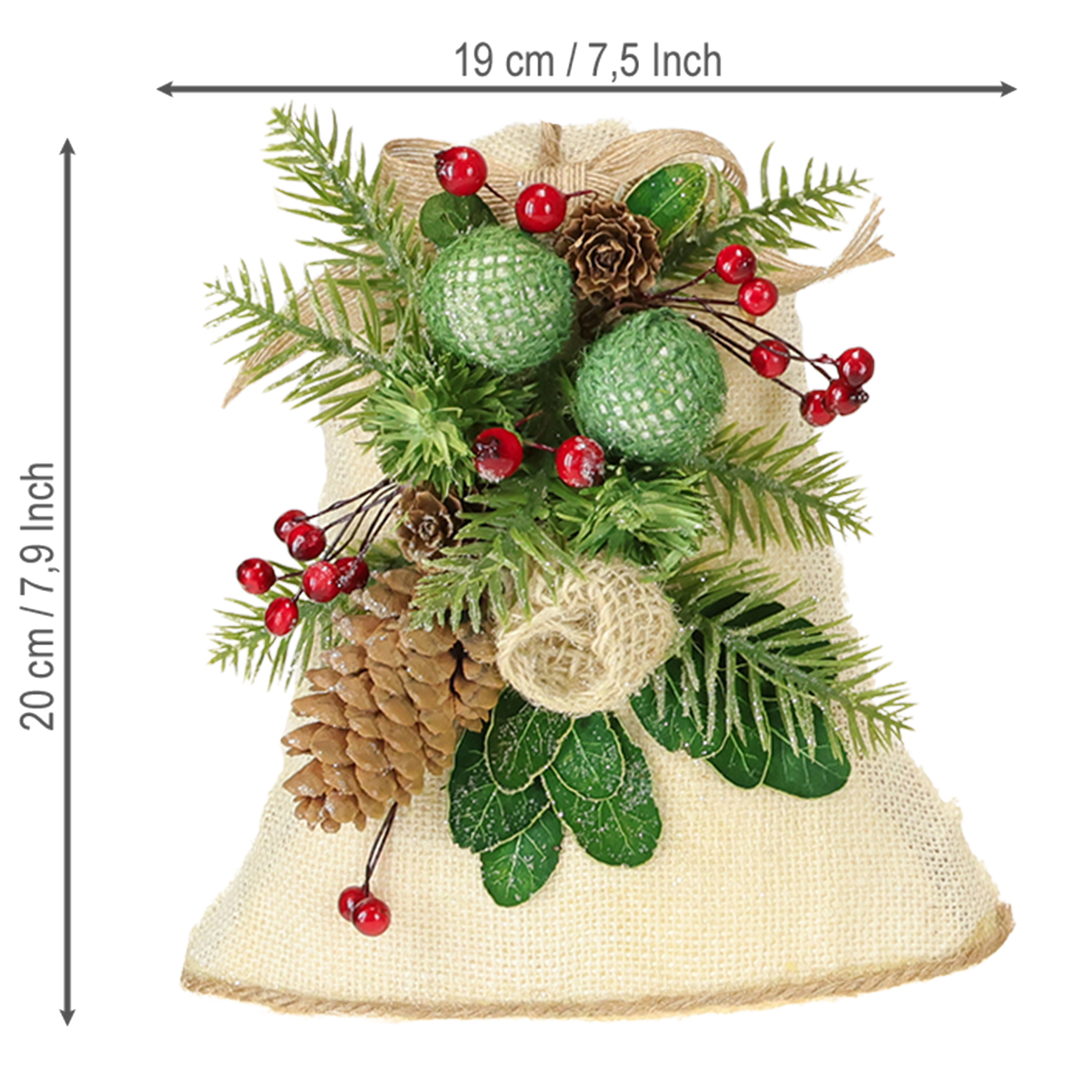 Seien Sie bereit, in die zauberhafte Weihnachtswelt einzutauchen! Unsere Wanddeko für Weihnachten als Glocke mit Jute bringt das gewisse Etwas in Ihre vier Wände. Stellen Sie sich vor: Sie betreten Ihr Zuhause und werden von einem warmen, einladenden Ambiente empfangen. Diese dekorativen Glocken, liebevoll mit Tannenzweigen, Stoffdetails und echten Zapfen geschmückt, versprechen pure Weihnachtstimmung. Die natürliche Jutekordel verleiht ihnen einen rustikalen Touch, der gleichzeitig beständig und stilvoll ist. Möchten Sie Ihren Eingangsbereich aufpeppen oder den Weihnachtsbaum auf ganz besondere Weise schmücken? Mit diesen Glocken gelingt es spielend, eine festliche und gemütliche Atmosphäre zu schaffen, die jeden willkommen heißt.