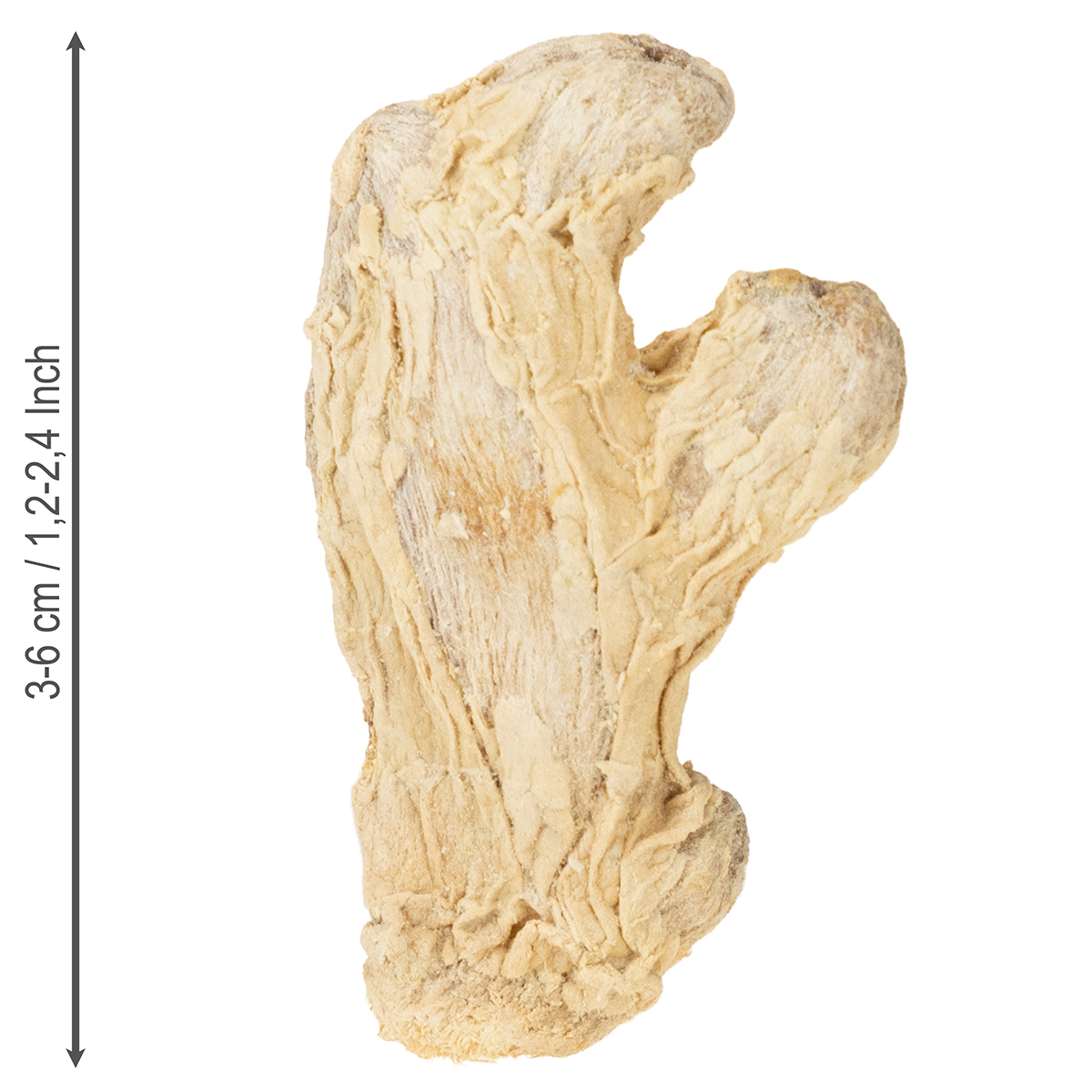 Le gingembre séché est livré en sachet de 500 grammes. La taille des pièces individuelles varie et peut être comprise entre 3 et 6 centimètres.