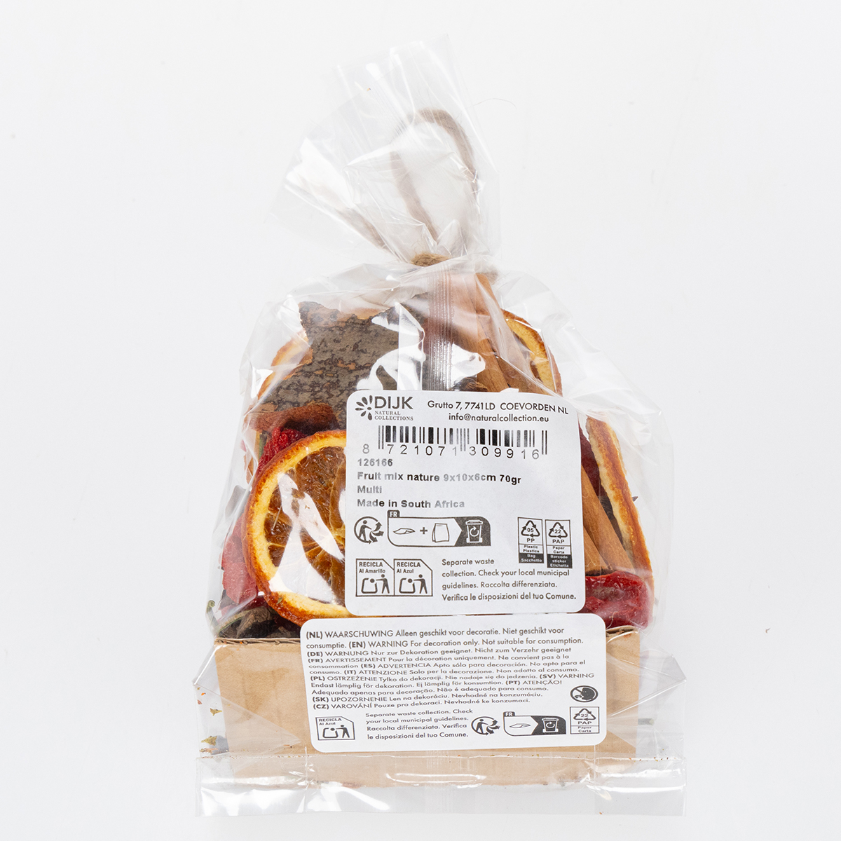 - Inhoud: Gedroogde sinaasappelschijfjes, kaneelstokjes, steranijs, houten sterretjes, rode sierpepers