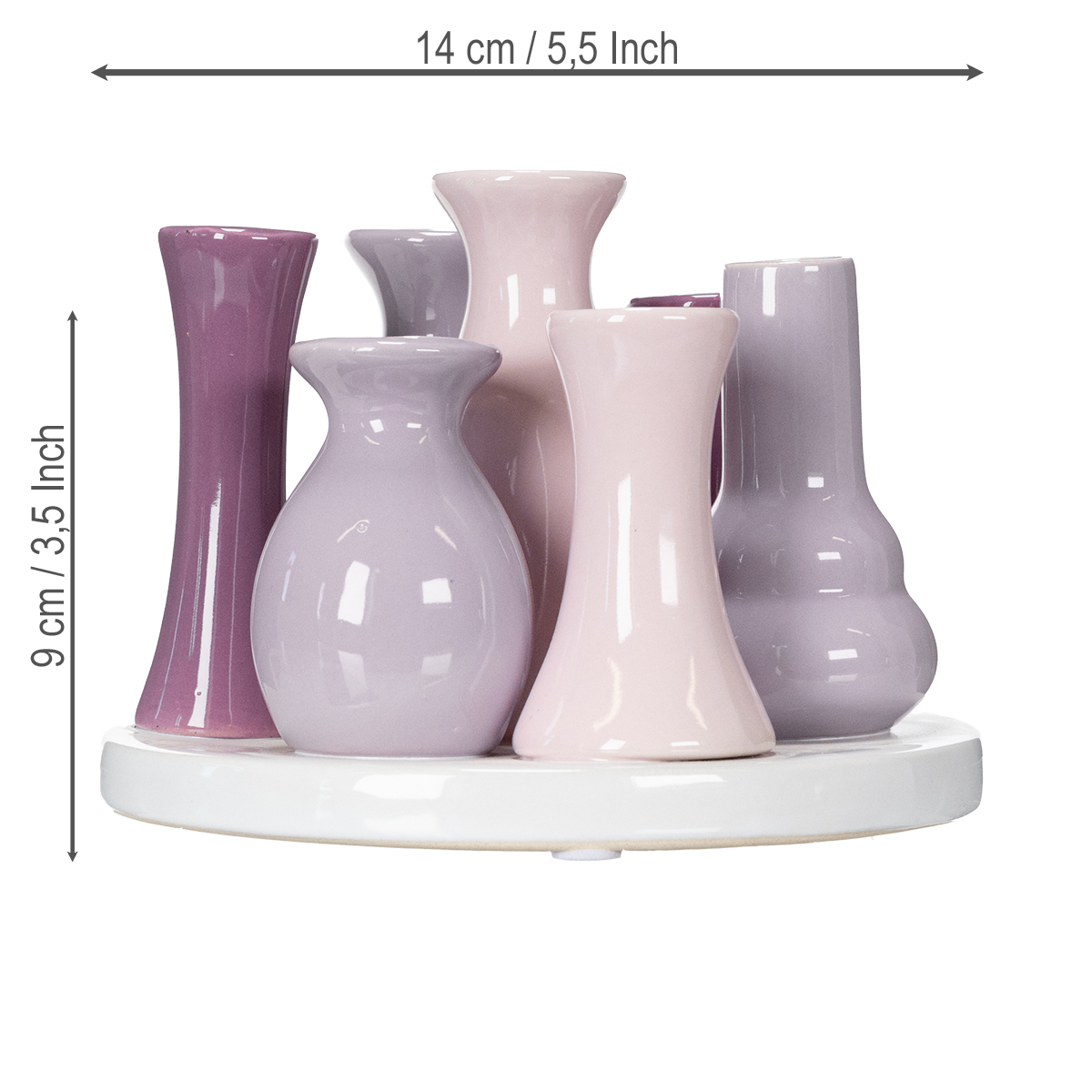 Sie suchen nach einem besonderen Akzent für Ihr Zuhause? Etwas, das Frische, Eleganz und ein Hauch von Modernität verleiht? Dieses pastellfarbene Vasenensemble aus hochwertiger Keramik könnte genau das Richtige für Sie sein. Die sechs kunstvoll geformten Vasen, kombiniert mit einer stabilen weißen Keramikplatte, garantieren vielseitige Einsatzmöglichkeiten – von der Tischdekoration bis hin zum Regal-Highlight. Ob mit frischen Blumen, kleinen Trockenblumensträußen oder einfach einzeln als stilvolle Dekoration, diese kleinen Vasen setzen immer den richtigen Akzent. Die harmonische Farbpalette aus Rosa und Lila schafft dabei eine beruhigende und doch ansprechende Atmosphäre. Eine perfekte Wahl für alle, die Stil und Funktionalität schätzen und ihren Wohnbereich modern gestalten möchten.
