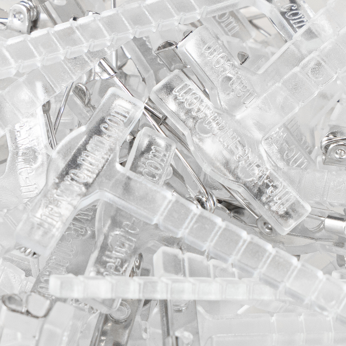 De trouwkaart van transparant kunststof en een zilveren naald wordt geleverd in een doos van 50 stuks en heeft een lengte van ongeveer 5 centimeter. Je kunt de badge ook gebruiken om naamplaatjes te bevestigen voor een workshop, kleine figuren voor een themafeest of bloemenjuwelen voor een gala-avond.