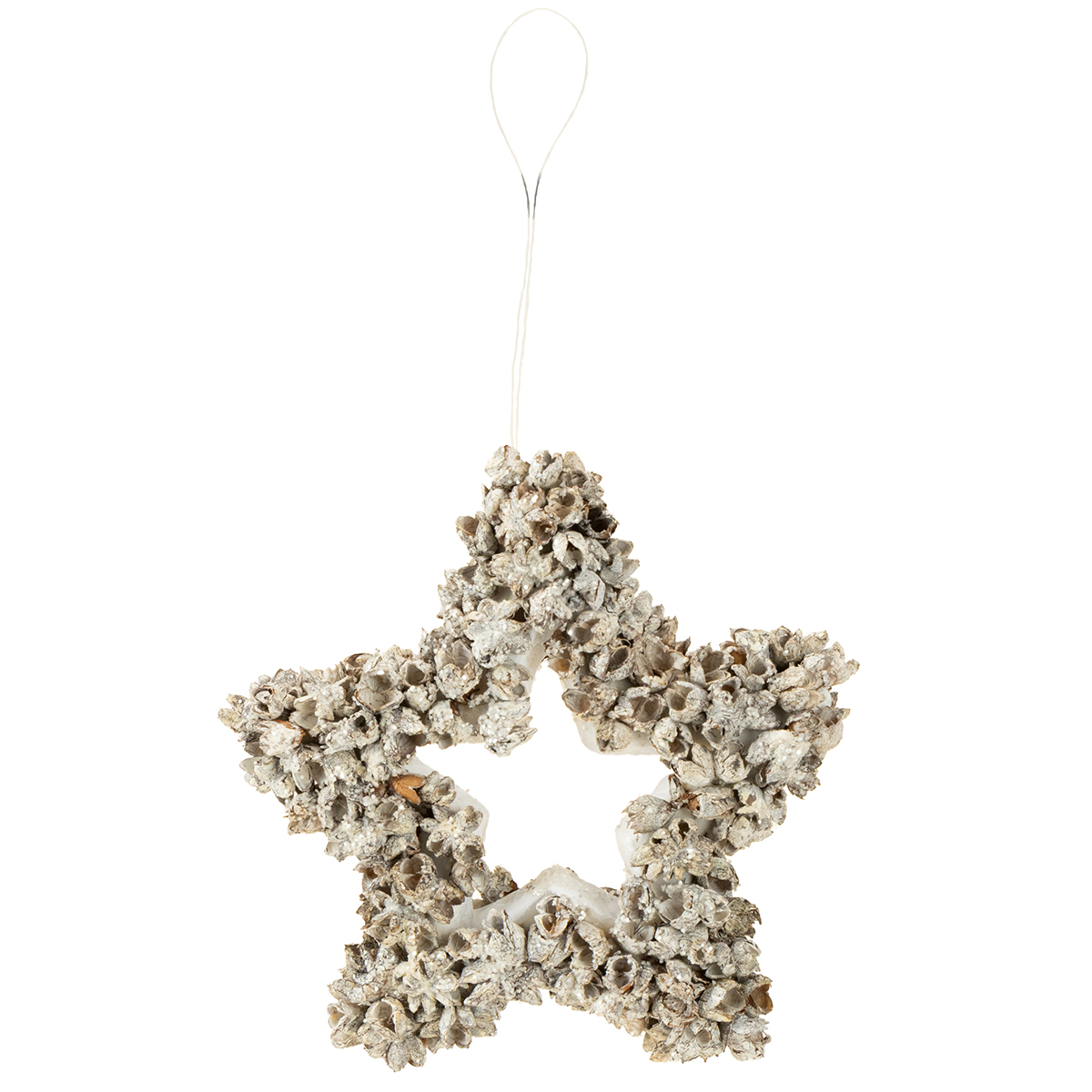 De witte glinsterende ster om op te hangen ziet eruit als vol ijs en sneeuw in de kerstversiering. De kerstster bestaat uit een piepschuim frame waarop talloze stervormige zaaddozen dicht bij elkaar zijn bevestigd. Door een bijna onzichtbare hanger lijkt de decoratiester als een sneeuwster in de lucht te zweven.De decoratieve ster om op te hangen wordt het hoogtepunt op een deurkrans en zorgt ook voor een blikvanger in de adventsdecoratie in het raam. De natuurlijke ster is geschikt als kerstboomversiering voor een grotere kerstboom. De ster van natuurlijke materialen komt ook goed tot zijn recht op dennentakken, in de etalage of aan de muur. Of je kunt de hanger verbergen en van de witte ster het hoogtepunt van een tafeldecoratie maken of de basis voor een adventsarrangement met een stompkaars.