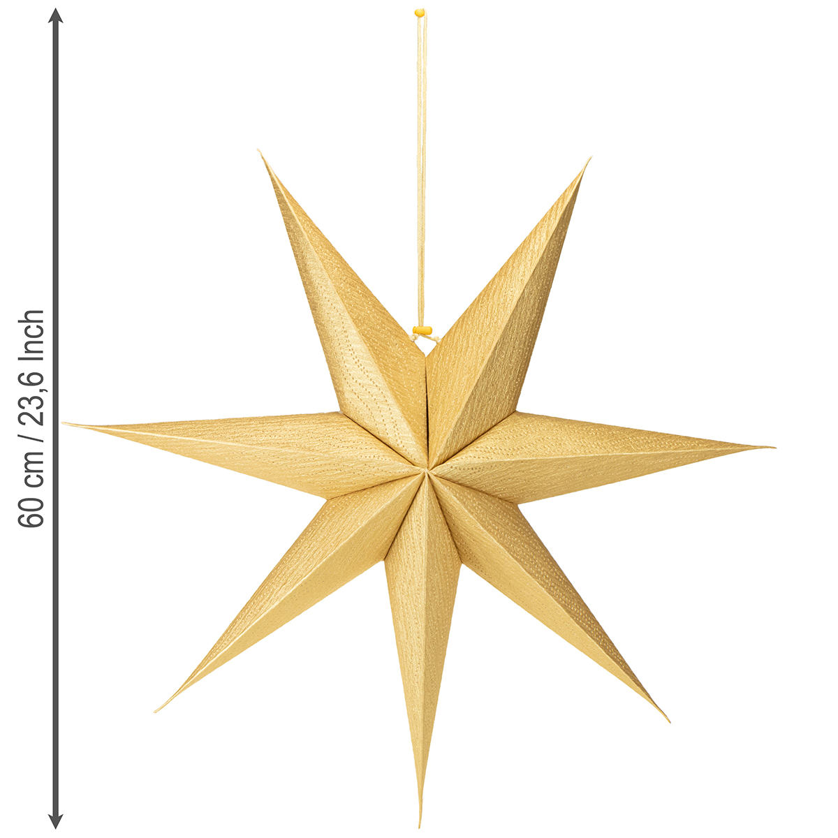 Der Papierstern besticht durch seine schlichte, zeitlose Eleganz. Filigran aus hochwertigem Papier gefertigt und in einem warmen Goldton gehalten, fügt er sich nahtlos in unterschiedliche Dekorationen ein. Das Material hat einen natürlichen Charme und ist dennoch robust genug, um Jahr für Jahr für glanzvolle Highlights zu sorgen. Mit einem Durchmesser von 60 cm ist der Stern groß genug, um in jeder Umgebung aufzufallen.