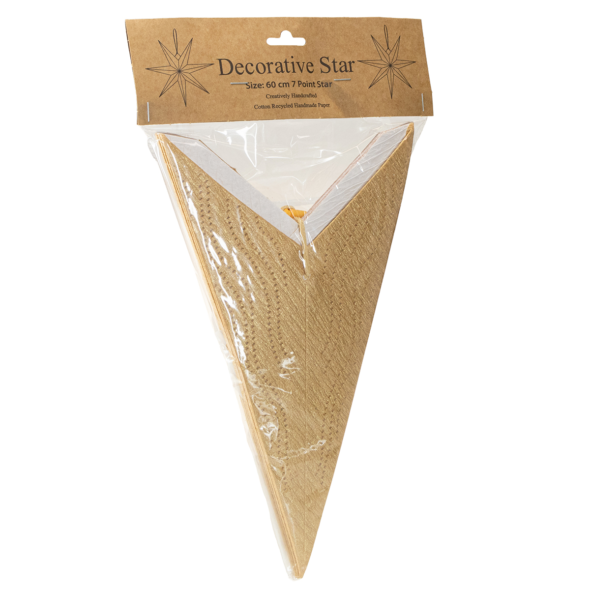 Deze papieren ster valt op door zijn eenvoudige, tijdloze elegantie. Delicaat vervaardigd van hoogwaardig papier en afgewerkt in een warme goudtint, past hij naadloos in diverse interieurs. Het materiaal heeft een natuurlijke charme en is tegelijkertijd robuust genoeg om jaar na jaar schitterende accenten te creëren. Met een diameter van 60 cm is de ster groot genoeg om in elke setting een statement te maken.