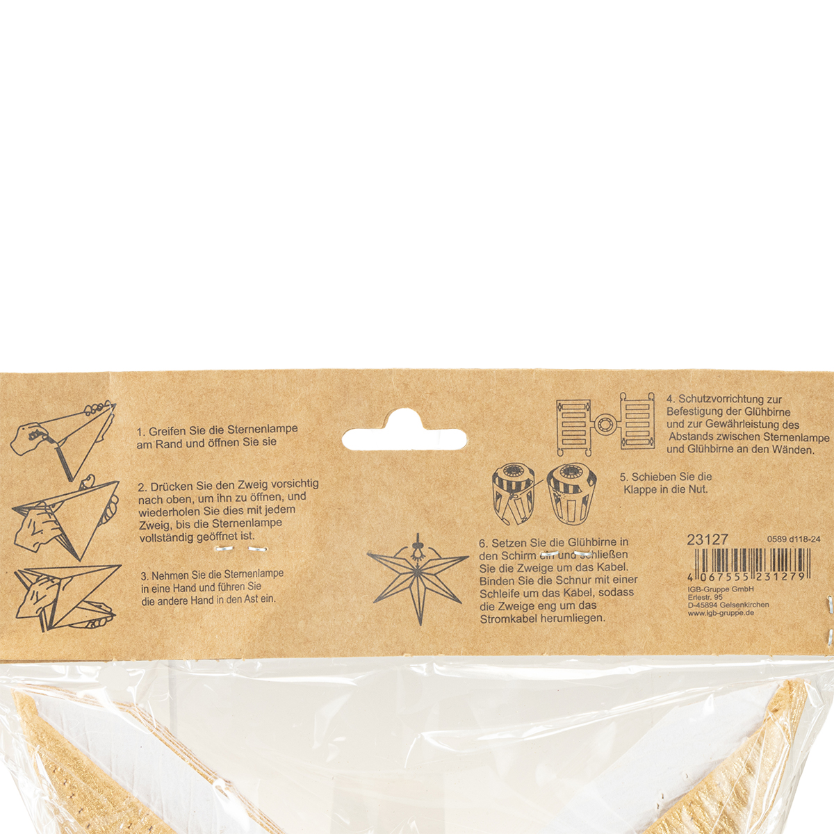 Het tijdloze design van deze kerstster maakt hem gemakkelijk te combineren met andere decoratieve elementen: versier hem met lichtsnoeren of hang hem gewoon bij kaarsen en dennentakken. Voor wie de voorkeur geeft aan een minimalistische look, staat de ster ook prachtig op zichzelf of tegen een effen muur. Voeg een gloeilamp of andere lichtbron toe en de ster geeft een aangenaam warm licht in het donker – perfect om de feestelijke sfeer in huis te versterken. Of je hem nu boven de feesttafel, in het midden van een raam of als middelpunt boven de open haard plaatst, deze klassieke kerstster trekt gegarandeerd ieders aandacht.