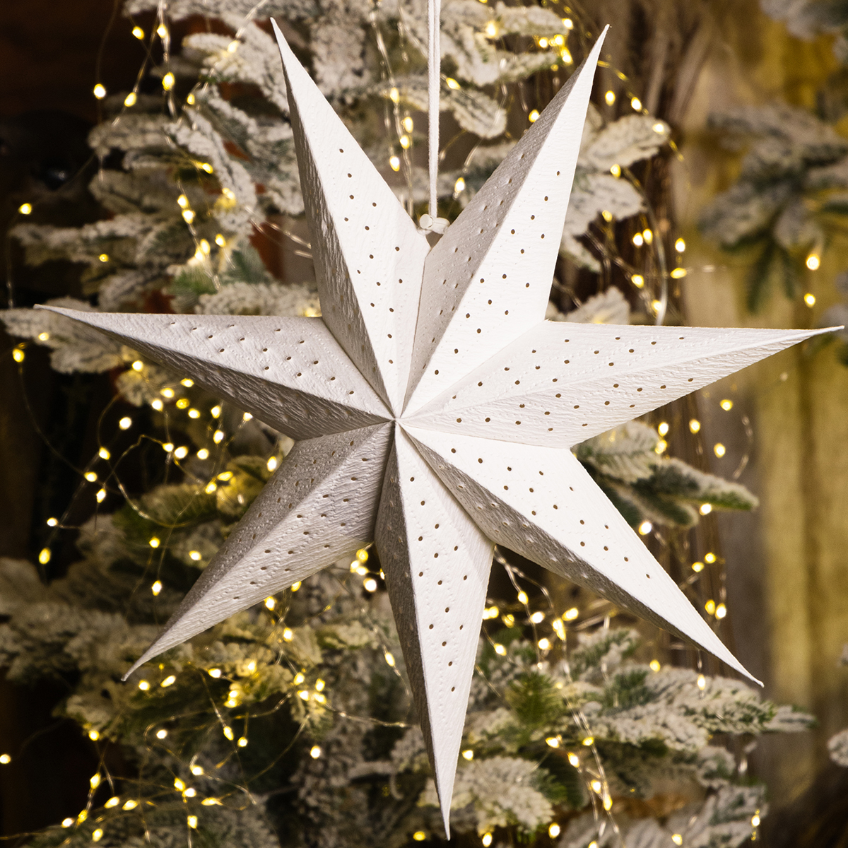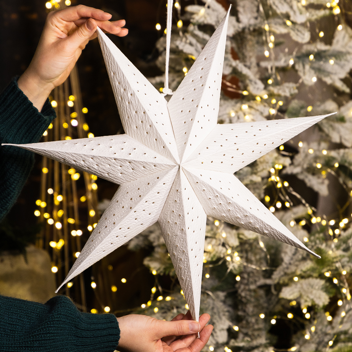 Die Papiersterne überzeugen nicht nur mit ihrem ansprechenden Design, sondern auch durch durchdachte Details. Gefertigt aus robustem Papier, sind sie stabil genug, um jedes Jahr aufs Neue die Weihnachtsdeko zu krönen. Dank ihrer Größe von 45 cm kommen sie am Fenster herrlich zur Geltung, können aber ebenso als elegante Beleuchtung über dem Esstisch oder als außergewöhnlicher Baum-Anhänger verwendet werden. Wer es etwas schlichter und natürlicher mag, wird die weißen Sterne lieben. Sie harmonieren wunderbar mit Tannenzweigen, beschneiten Kunstpflanznen, dezenten Christbaumkugeln oder auch mit anderen Papierdekorationen.