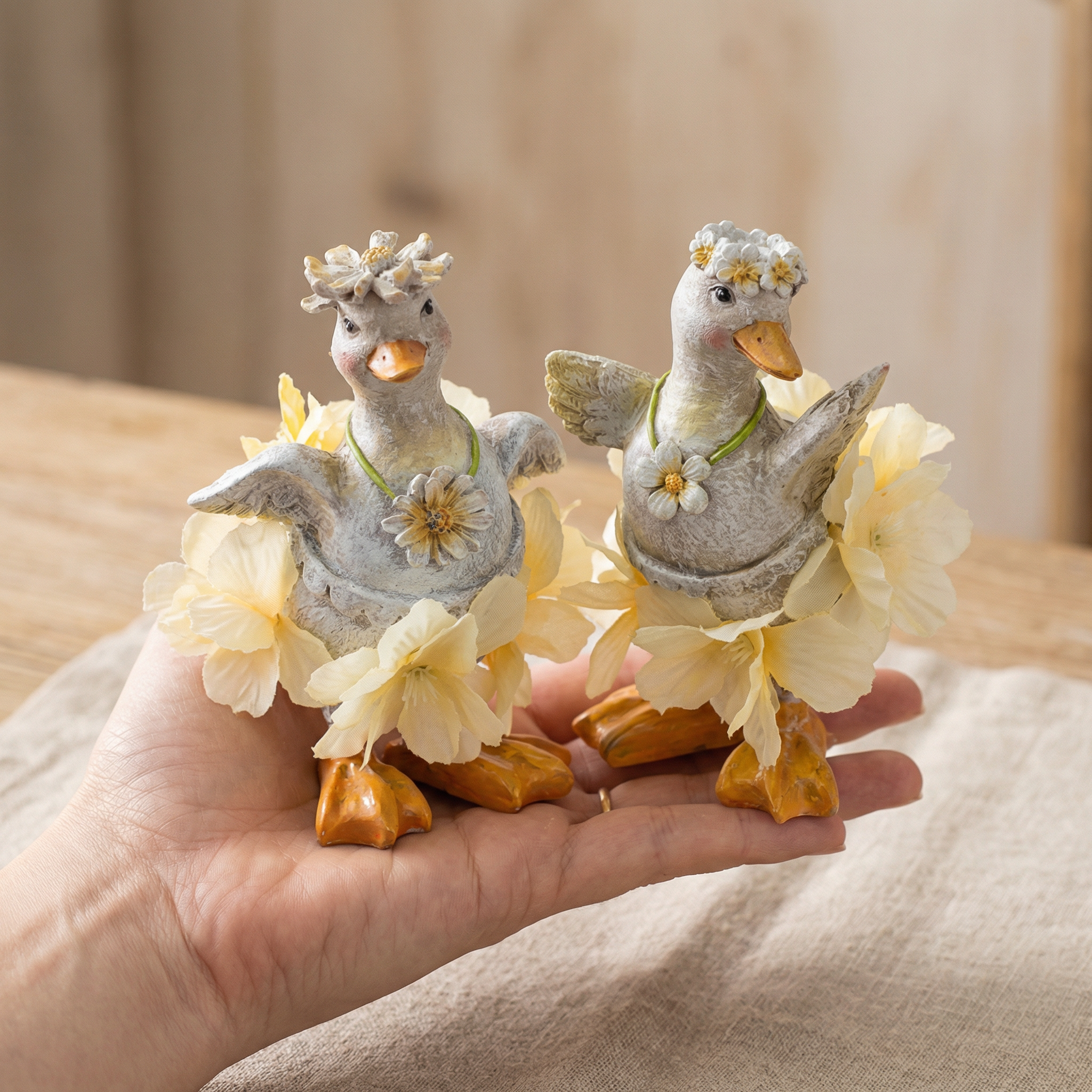 Intégrés à un décor scandinave ou moderne, ces canards délicats s'harmonisent à merveille avec des matériaux clairs et naturels comme le bois et le lin. Ils sont parfaits pour décorer au printemps ou à Pâques et créer une ambiance joyeuse.