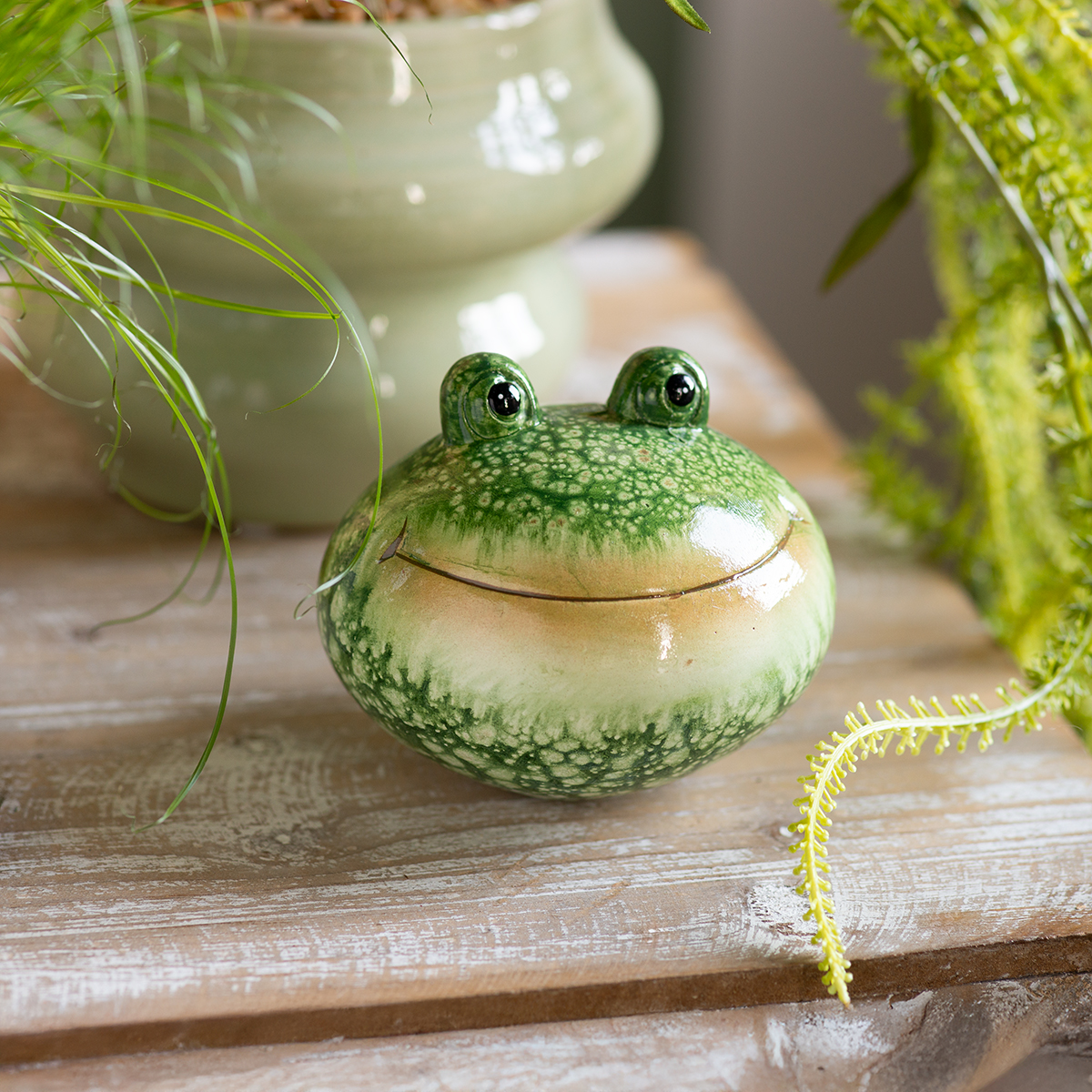 Die Figuren bestehen aus hochwertiger Keramik, die sowohl robust als auch wetterbeständig ist. Ob Sommerhitze oder leichter Regen – die Frösche bewahren ihr freundliches Lächeln. Besonders dekorativ wirken sie, wenn sie mit grünen Pflanzen oder Blumenarrangements kombiniert werden. Ein Freiluft-Highlight im Garten, auf Terrassen oder Balkonen. Aber auch im Innenbereich sind sie ein Hingucker: auf Regalen, Beistelltischen oder Schreibtischen zaubern sie Fröhlichkeit in den Raum. Wer Wert auf Details legt, wird begeistert sein – die feinen Musterungen und das fröhliche Design sprechen für sich.