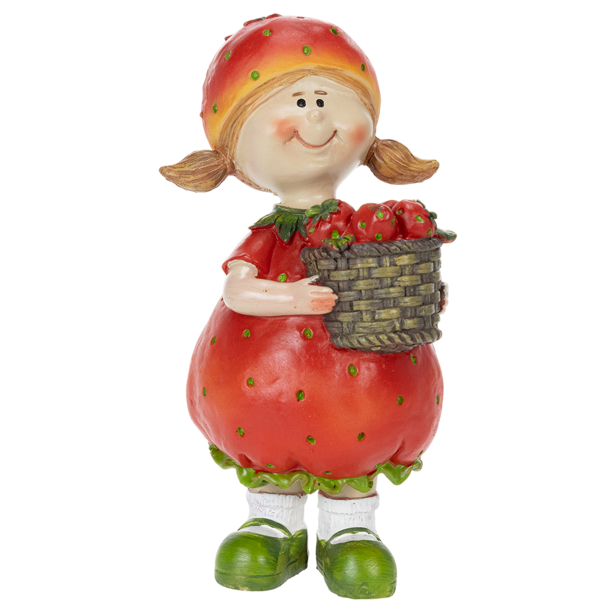 Mesurant 18 centimètres de haut et ornée de détails raffinés, la Petite Fille aux Fraises est une figurine décorative qui apporte une touche de féerie à n'importe quelle pièce. Ses teintes rouge et verte éclatantes sont parfaites pour agrémenter un coin de balcon avec des plantes, une étagère de salon ou une table de fête estivale. Sa ravissante robe à fraises, sa jolie tresse et son panier débordant de fraises créent un ensemble harmonieux.
